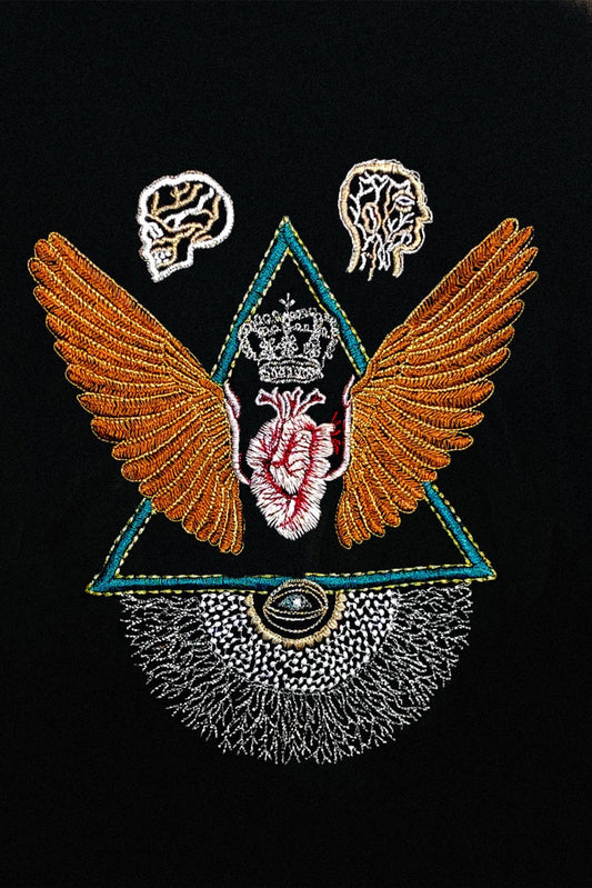 Sacred Geometry Embroidered Artwork Half Sleeve Black T-shirt For Women