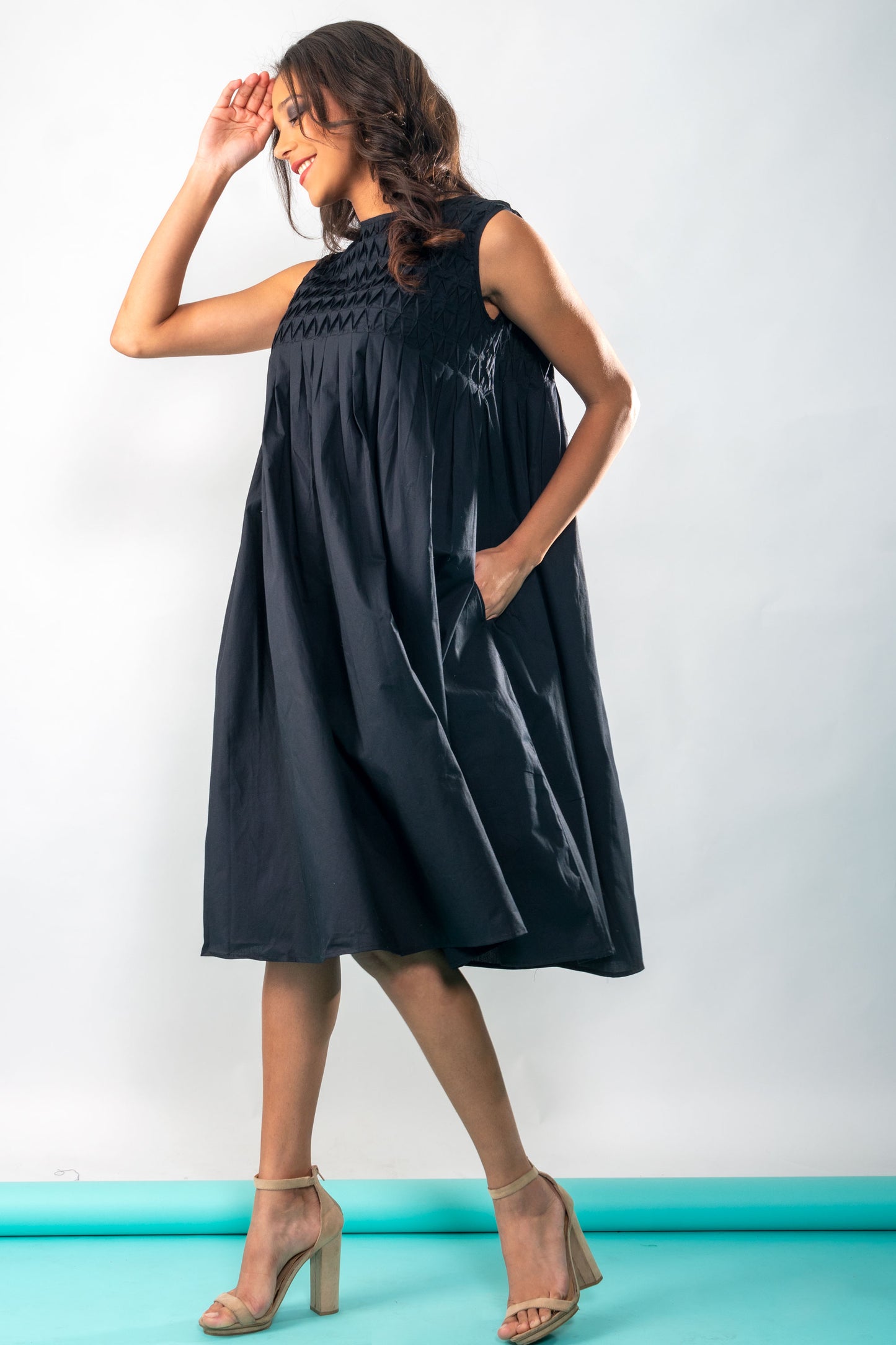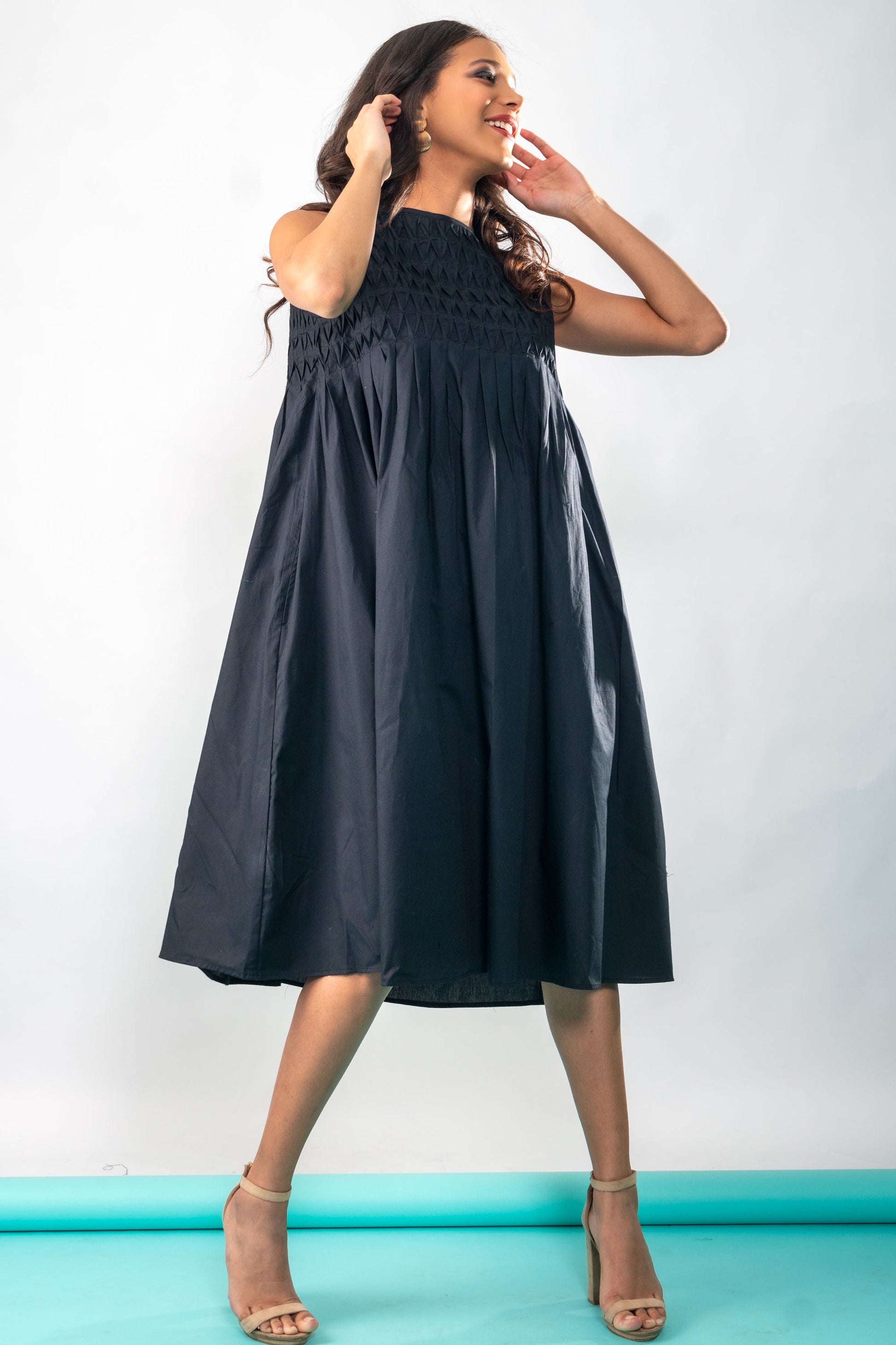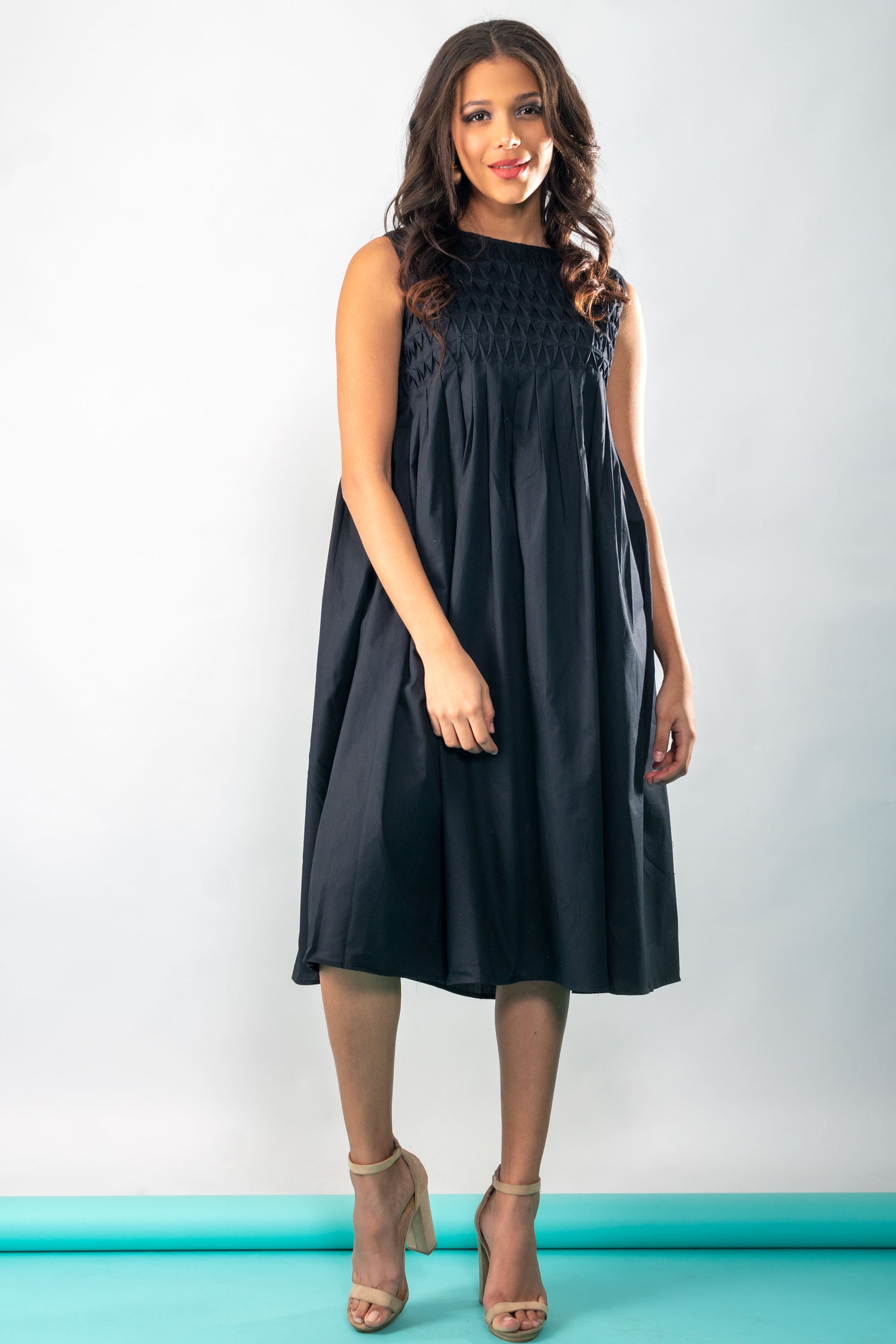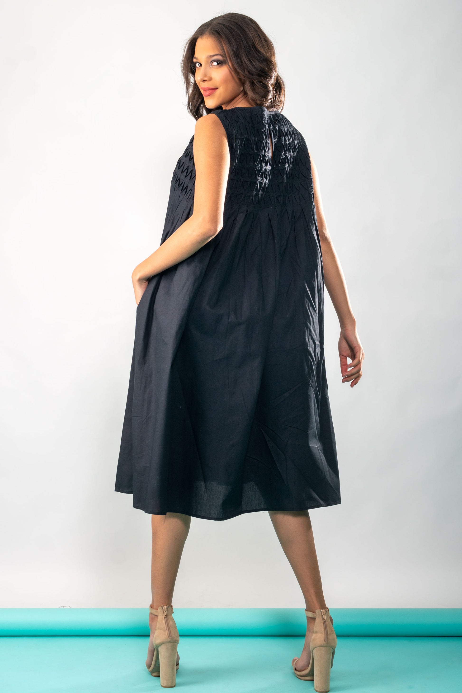Crafted from soft cotton poplin, this midi dress is so classic with beautiful silhouette. Additionally, the dress is adorned with a unique wild floral artwork that is complemented by a lace patched on yoke for style and curve enhancement along the side pocket and smocking at back. An ideal choice for office and casual wear.