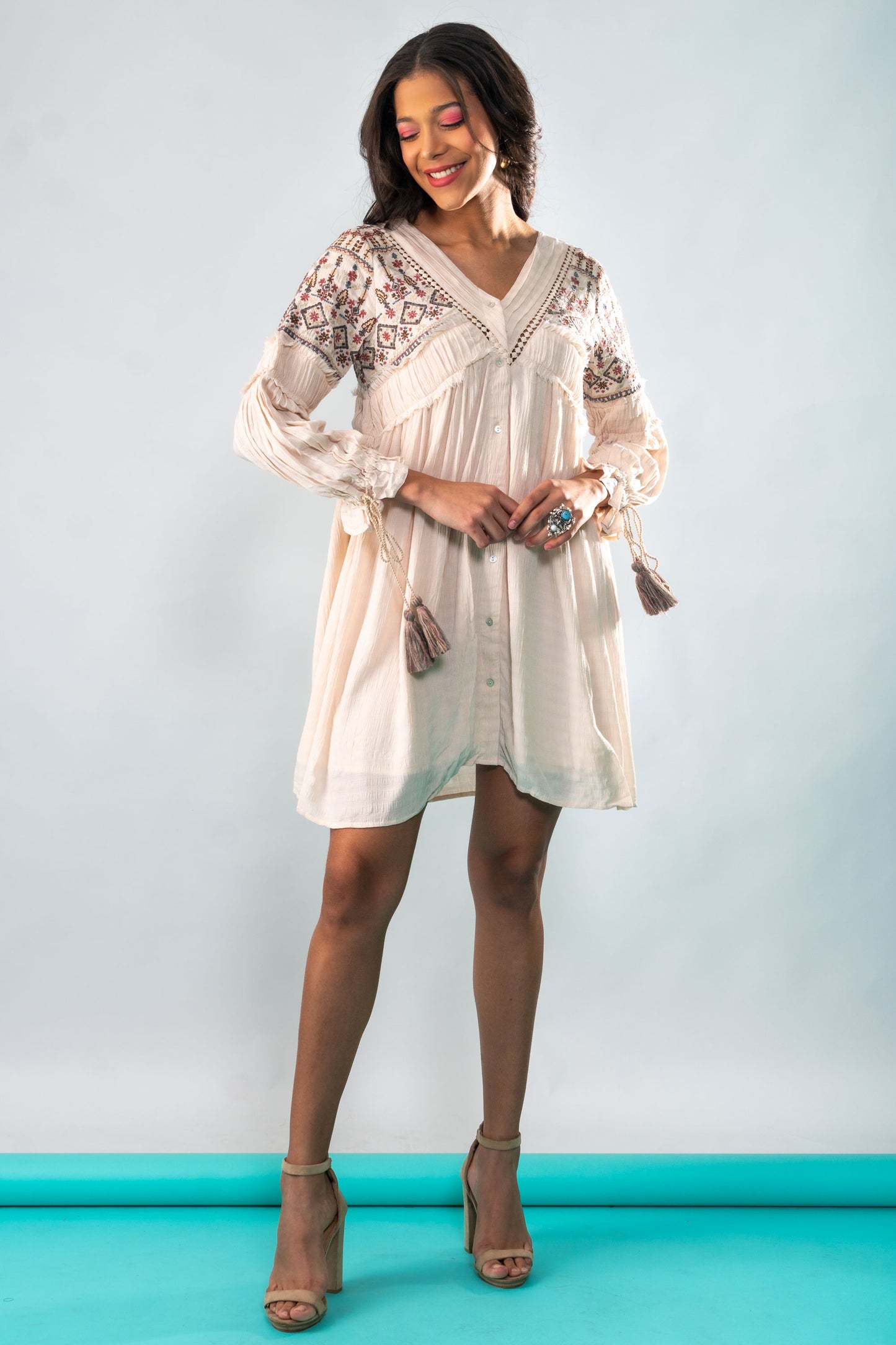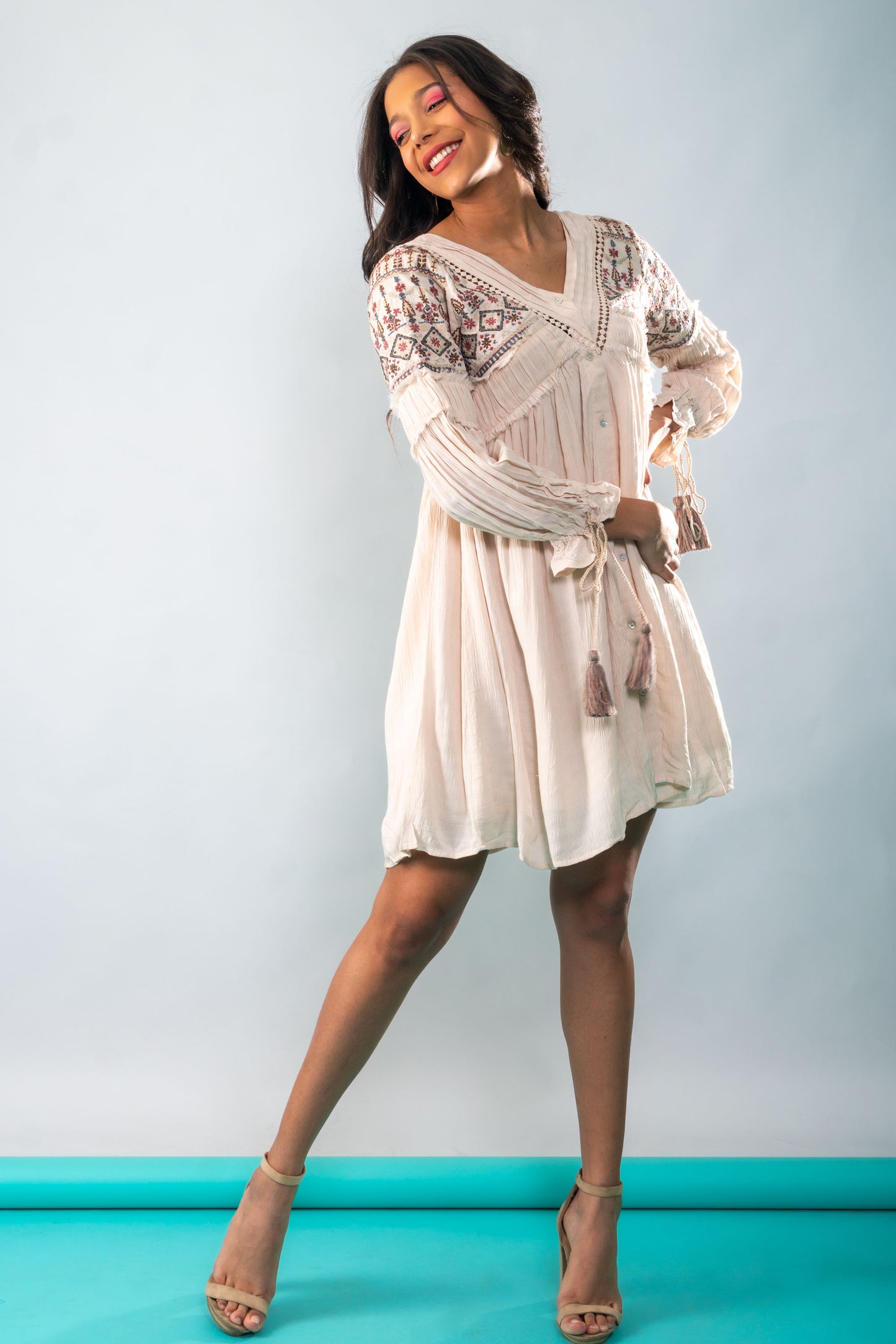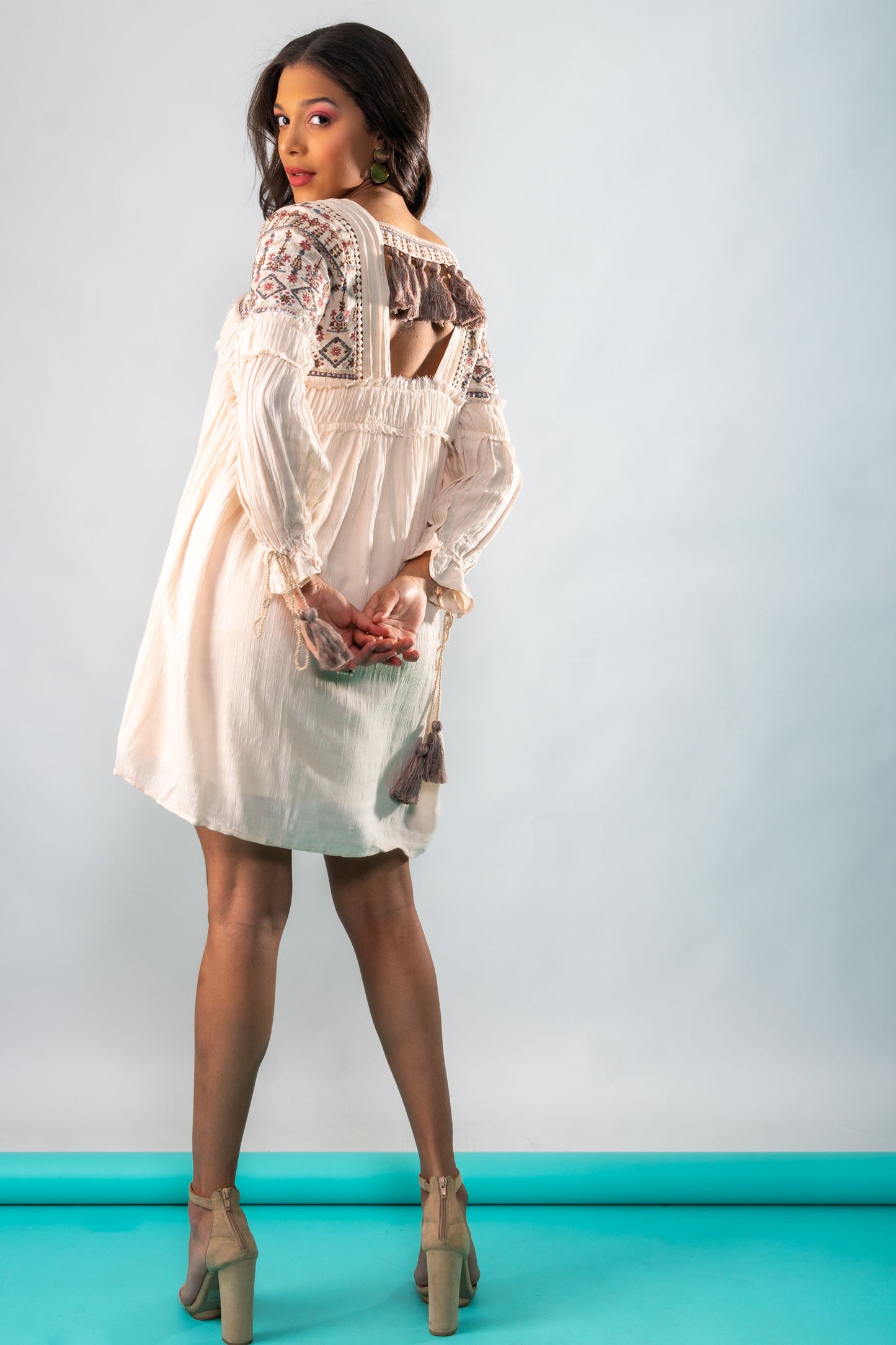 Peach dress Made in natural material with muted embroidery and boho tassels, Perfect fit for extra comfortable.