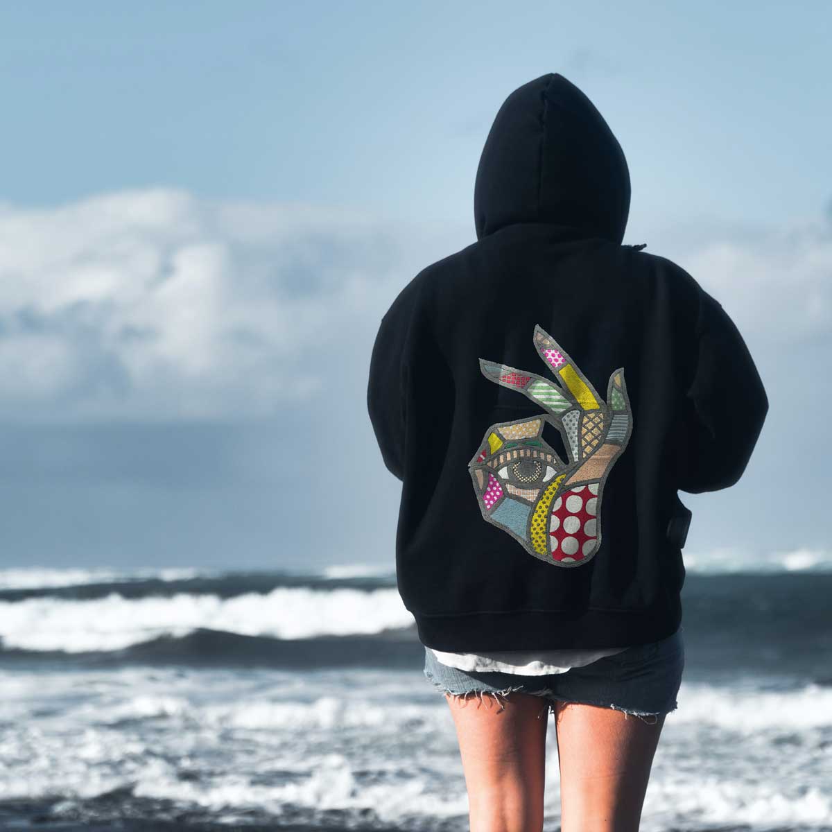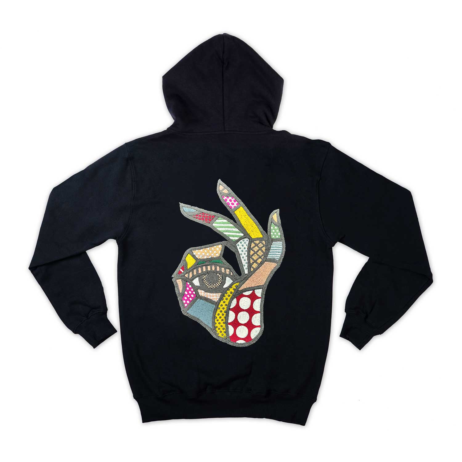 Relaxed-fit Hoodie in 430 GSM cotton fleece with embroidery artwork, jersey-lined, drawstring hood, dropped shoulders, long sleeves, a kangaroo pocket and wide ribbing at the cuffs and hem.