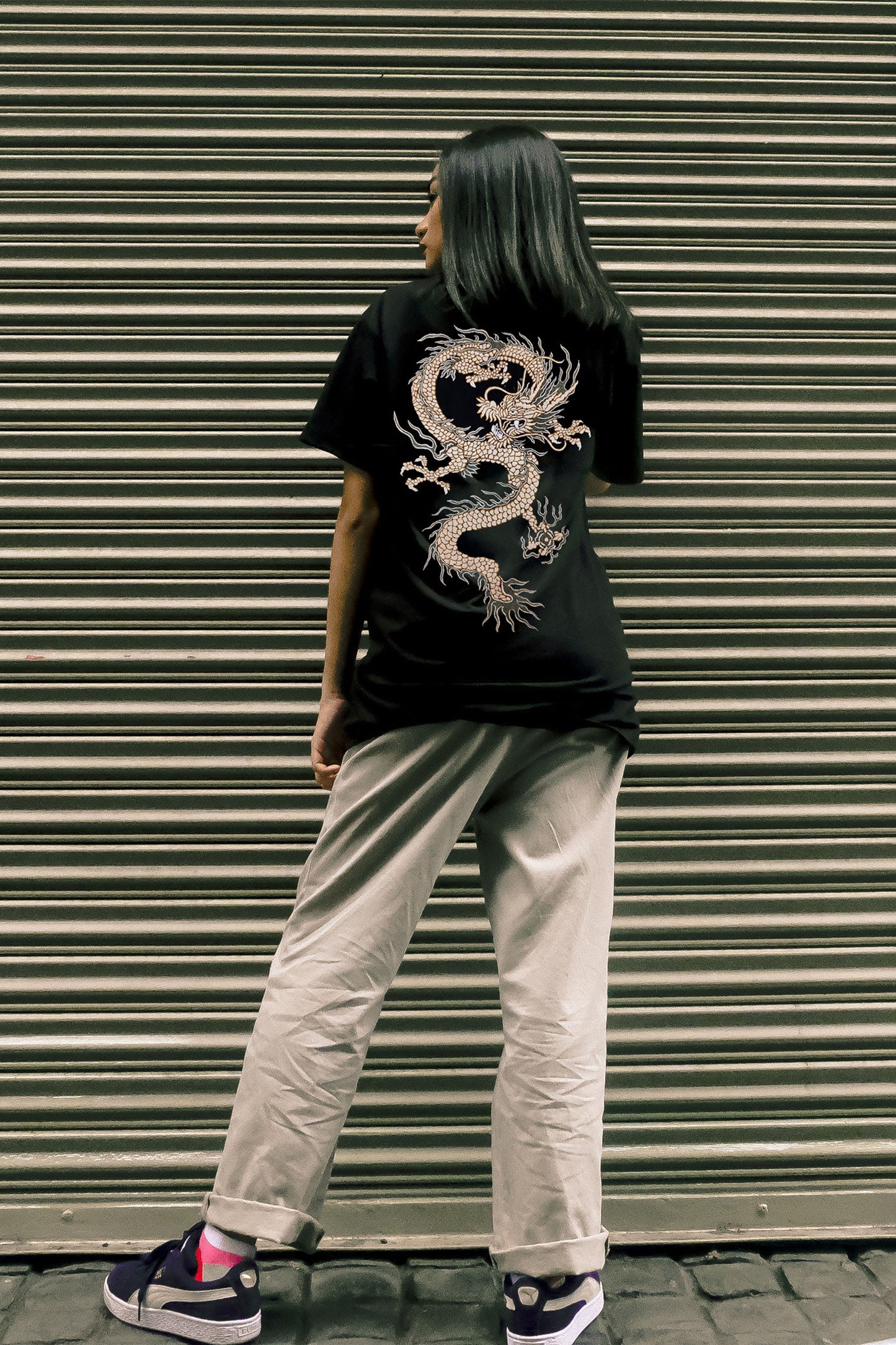 Japanese Dragon Embroidered Artwork Half Sleeve Black T-shirt For Women