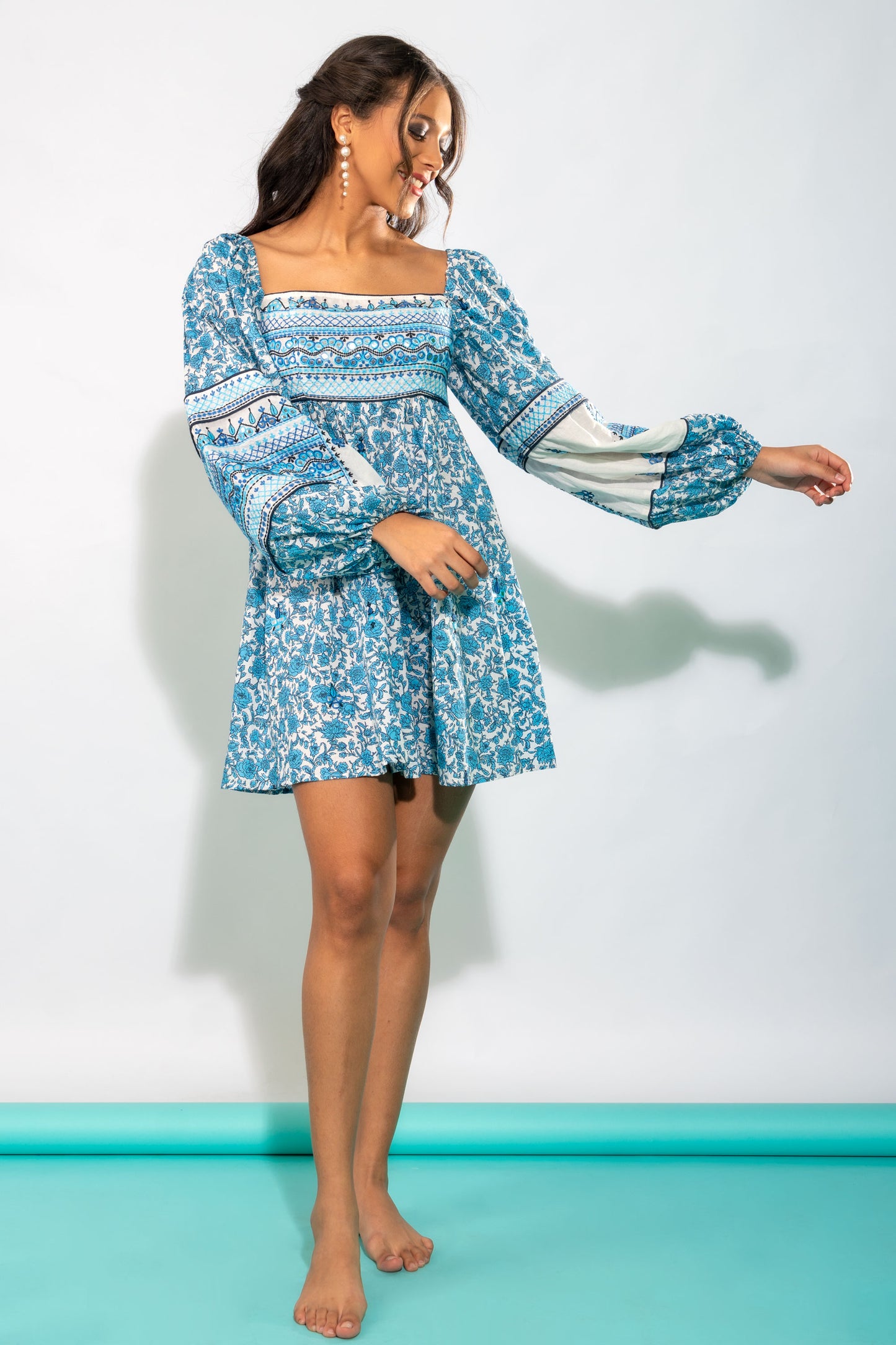 Cotton cambric mini dress in print with contrast mirror embroidery is perfect for this festive season. Elastic smocking at back for comfort fit. Beautiful designing with volume sleeve and contrast piping to highlight.