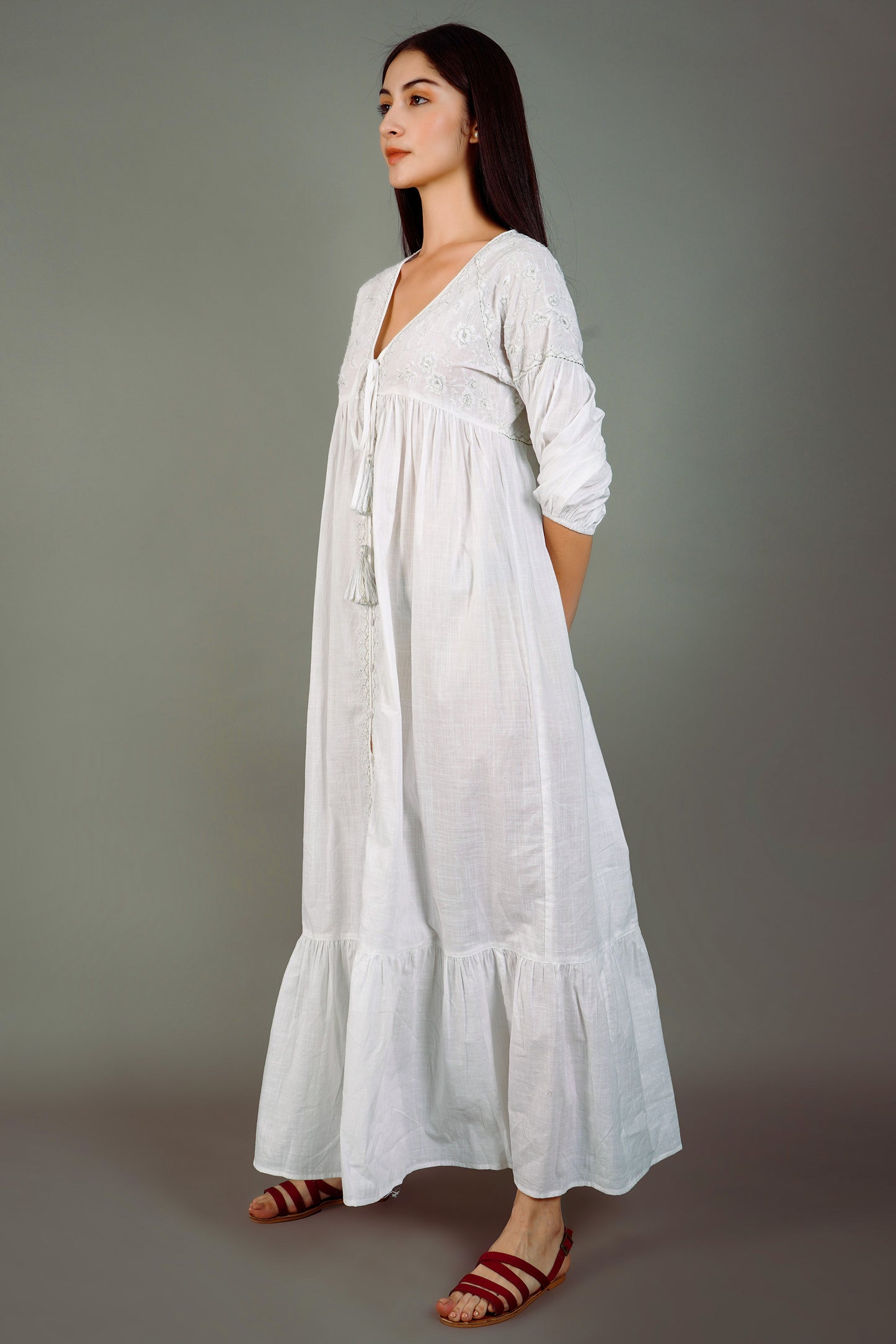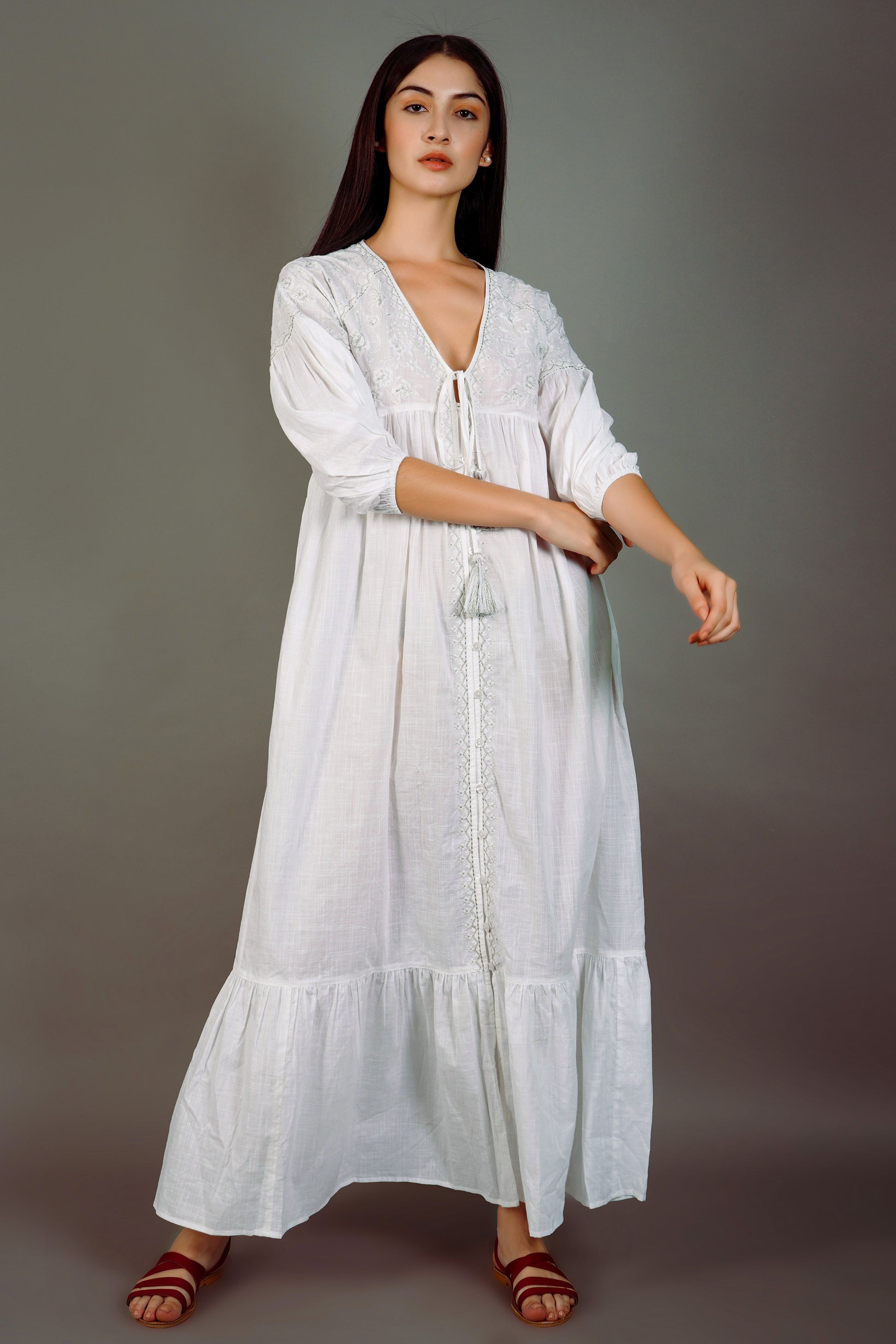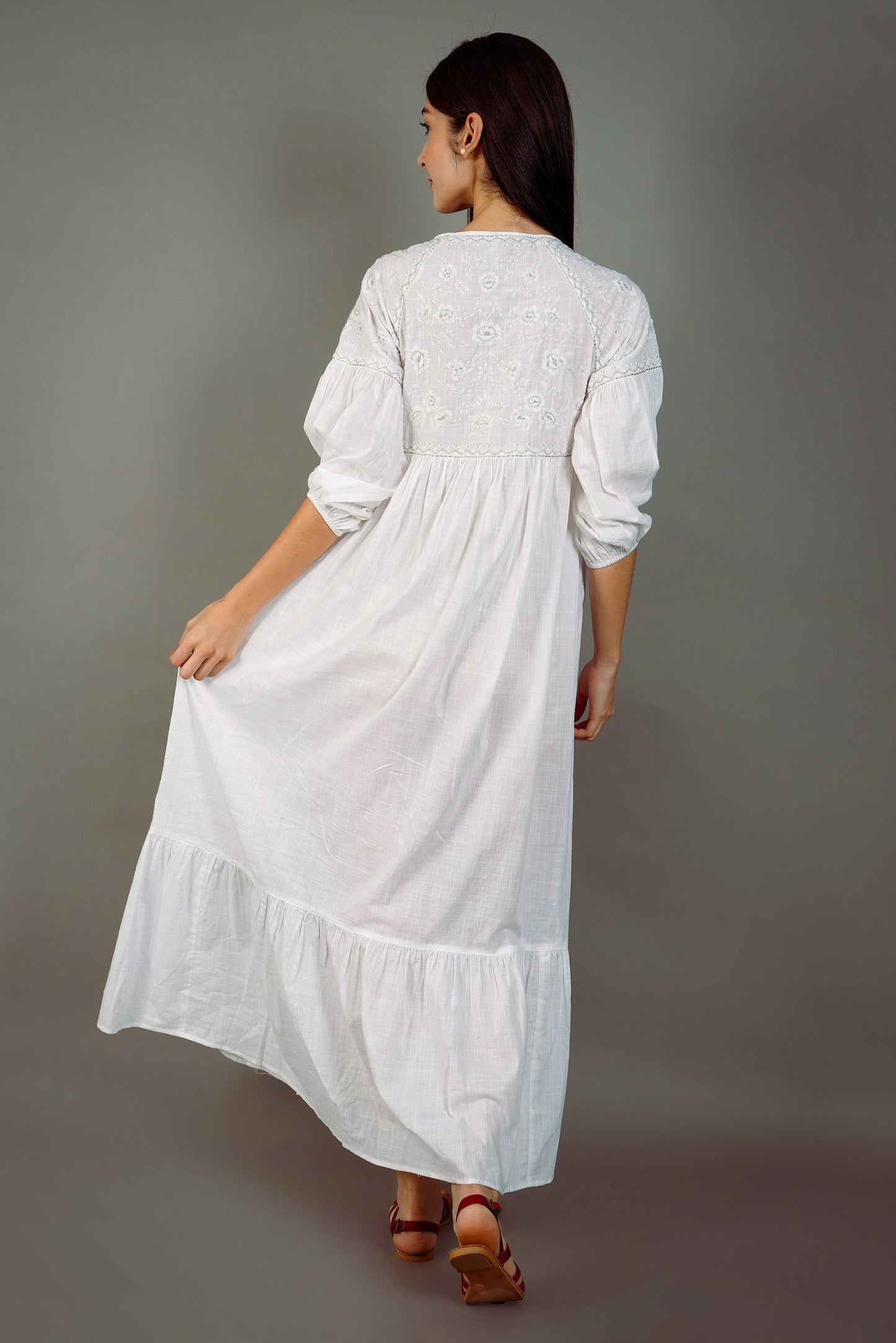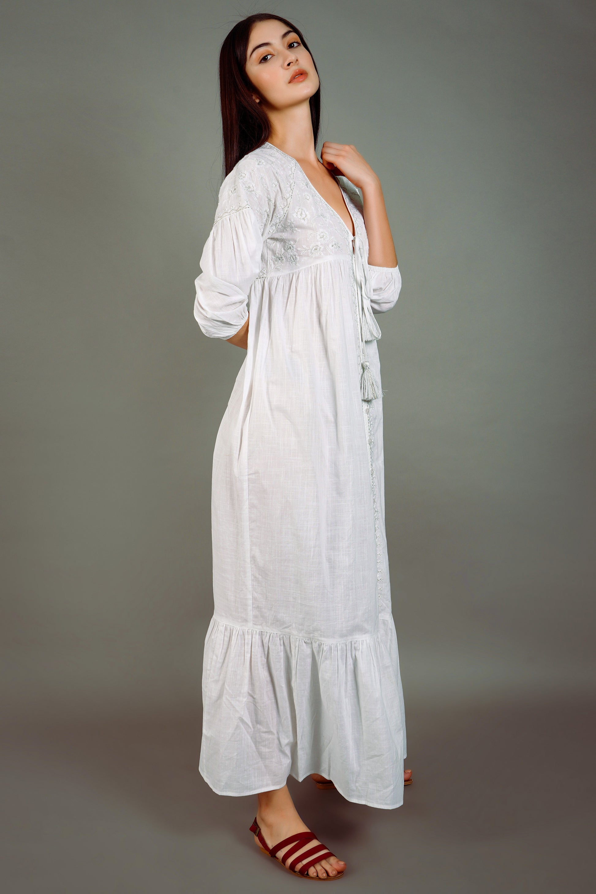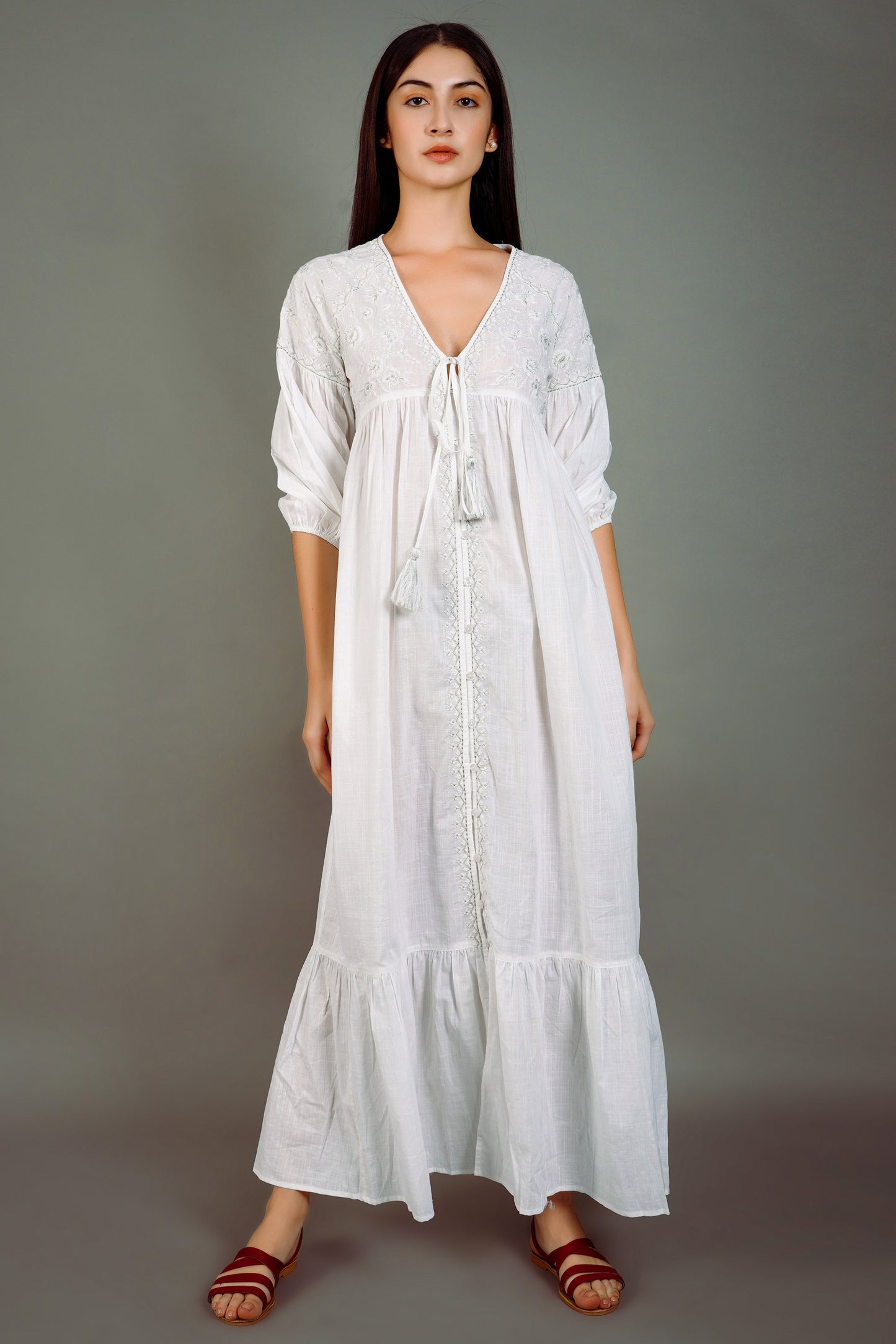Cotton hedge-cross white long dress with tonal embroidery with zari highlight. Your wardrobe will thank you for snagging this versatile dress! Designed with breezy cotton fabric and intricate embroidery (it's not just any ol' zari), this piece will put a spring in your step (and make you the envy of all your fashion-forward friends)!