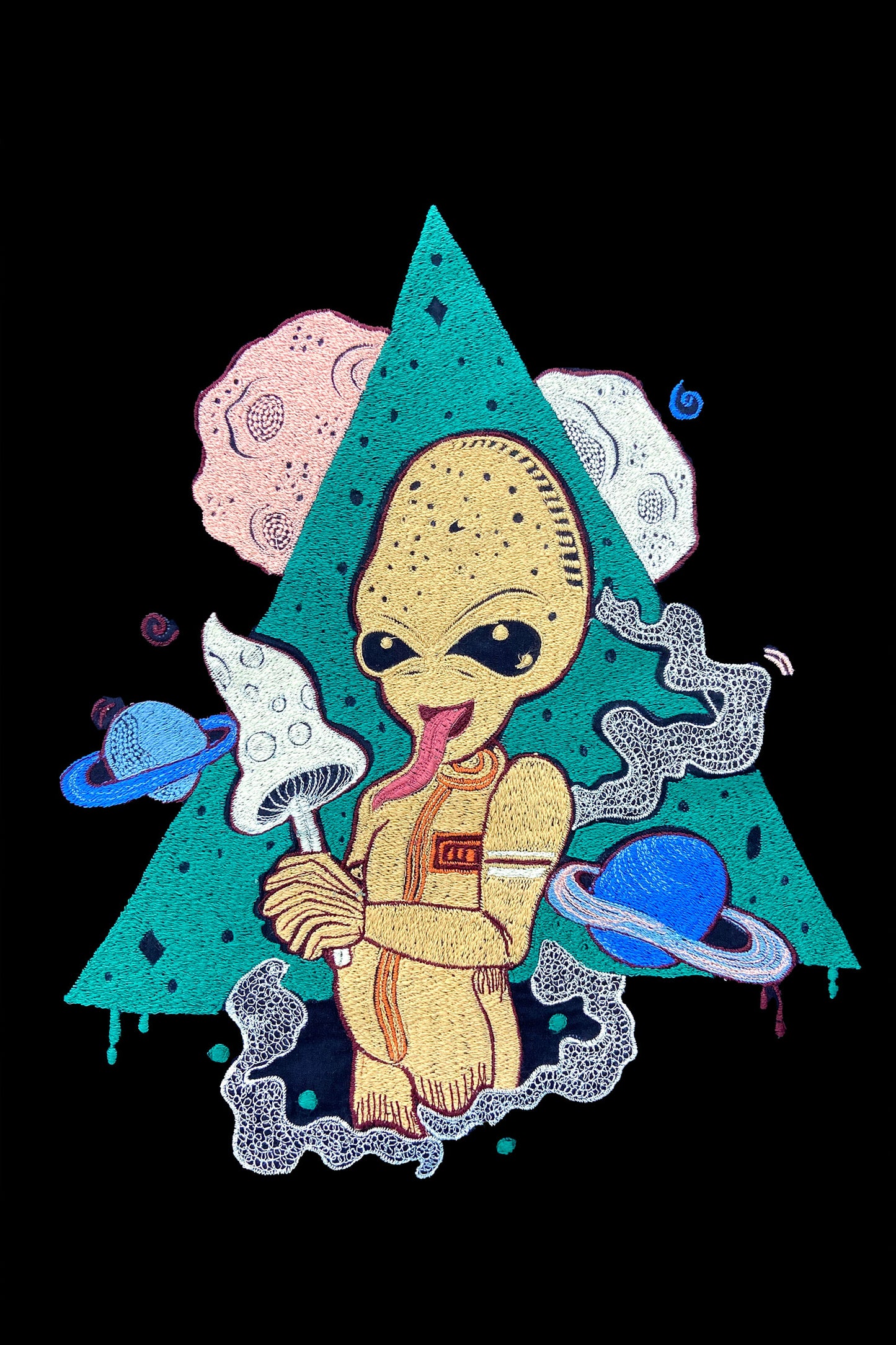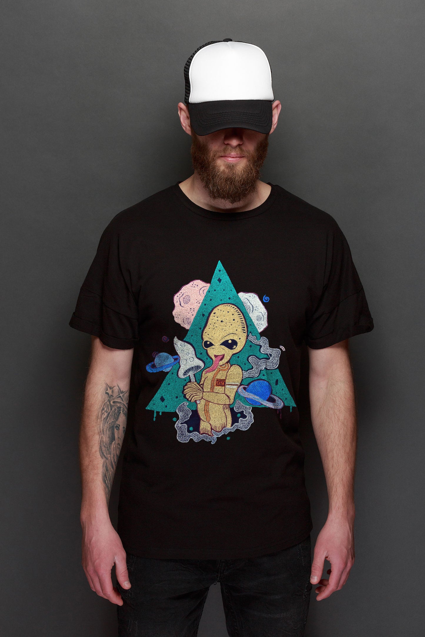 Alien Trip Embroidered Artwork Half Sleeve Black T-shirt For Men