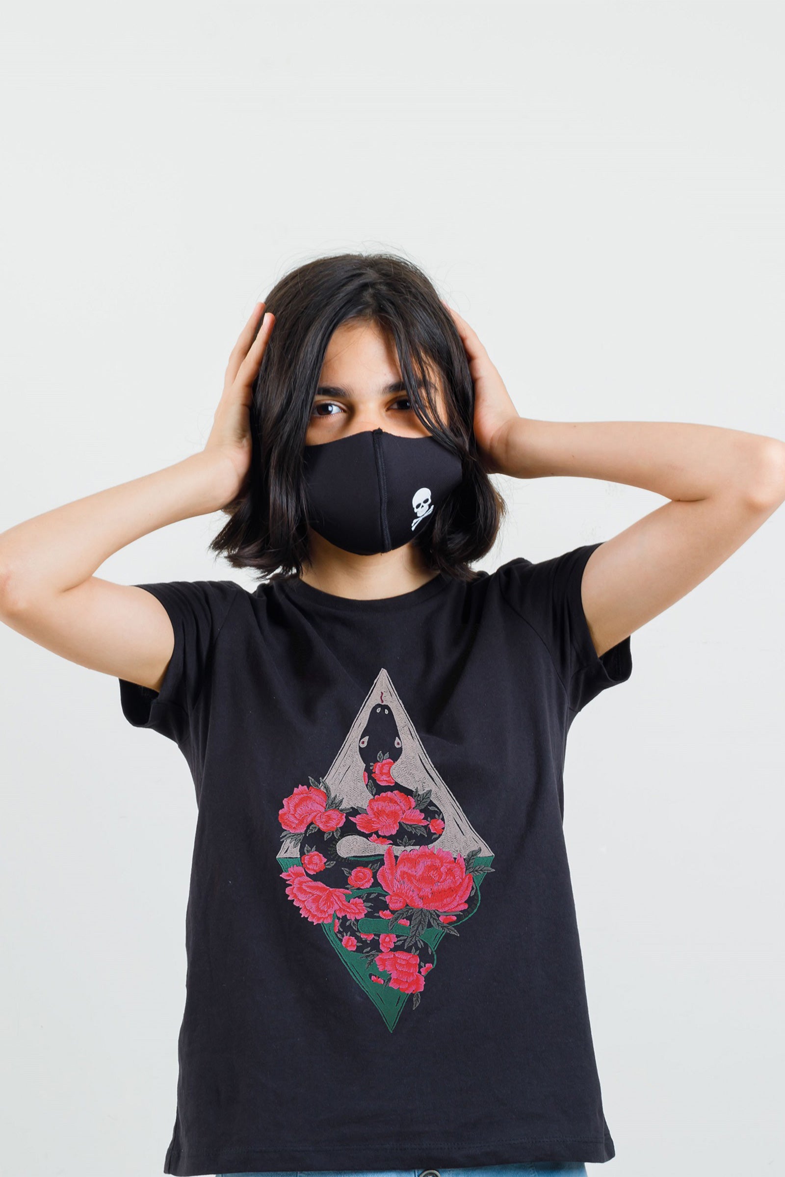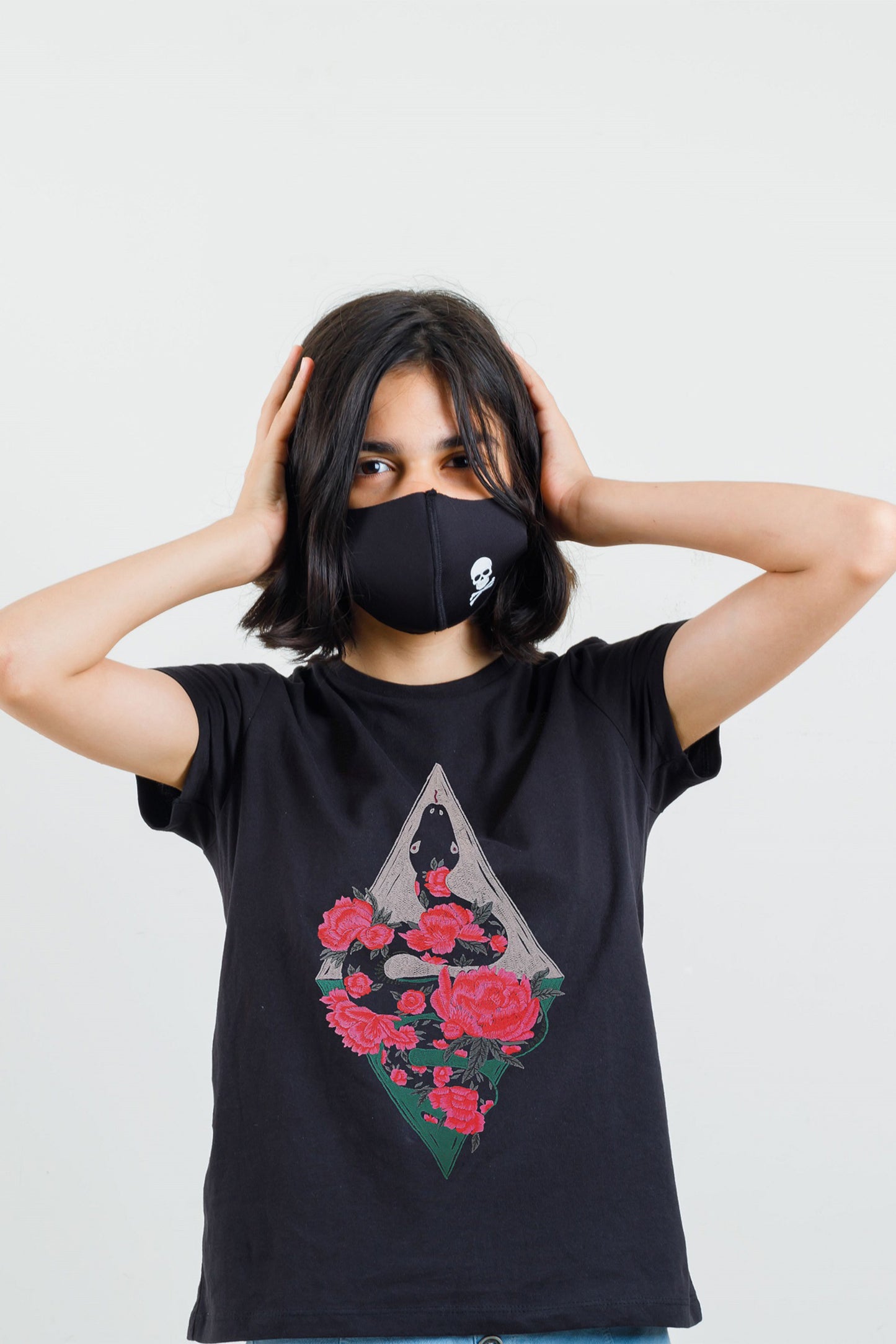 Rose Snake Embroidered Artwork Half Sleeve Black T-shirt For Women
