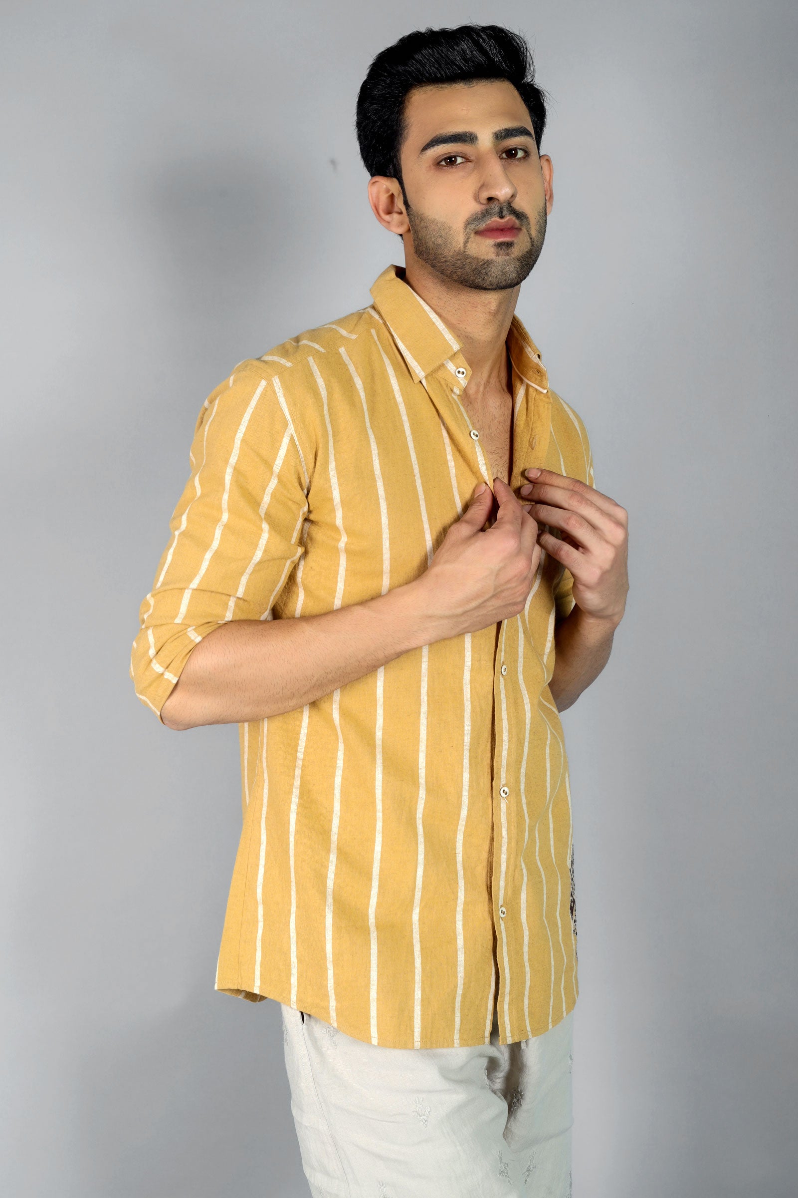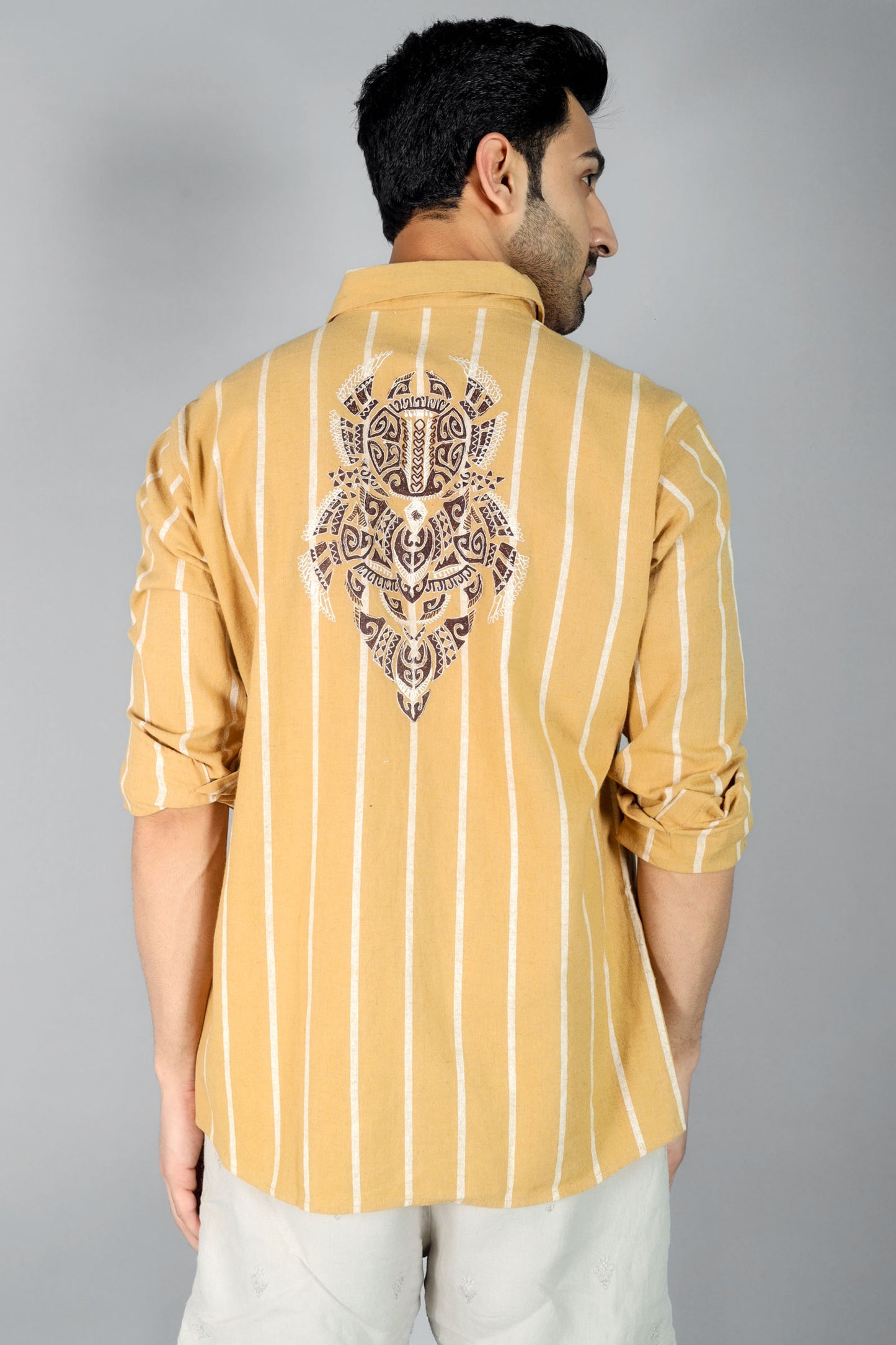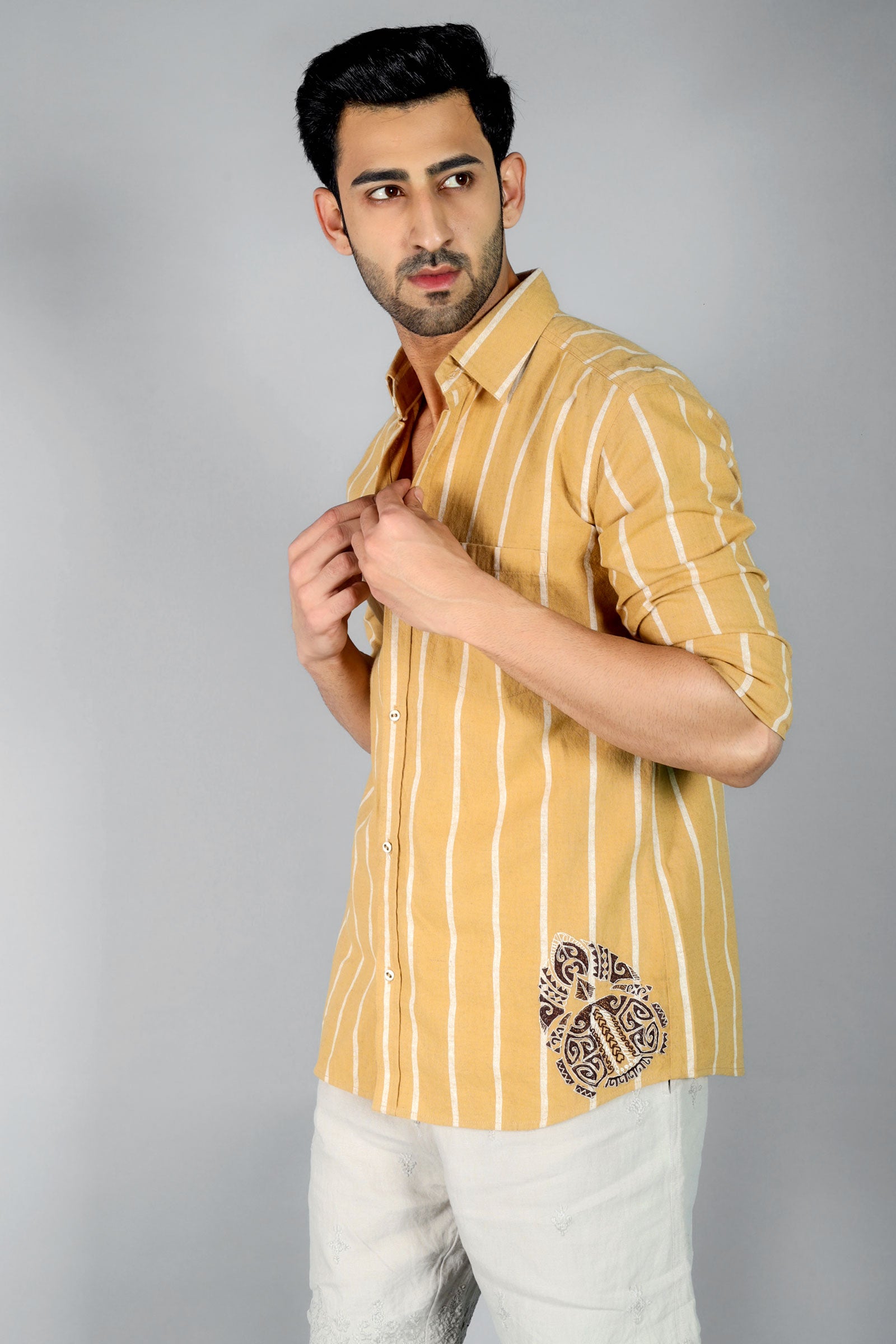 This Cotton flex stripe shirt features Tribal Embroidery on the front and back, offering easy wearability with a chic style suitable for both office and casual settings.