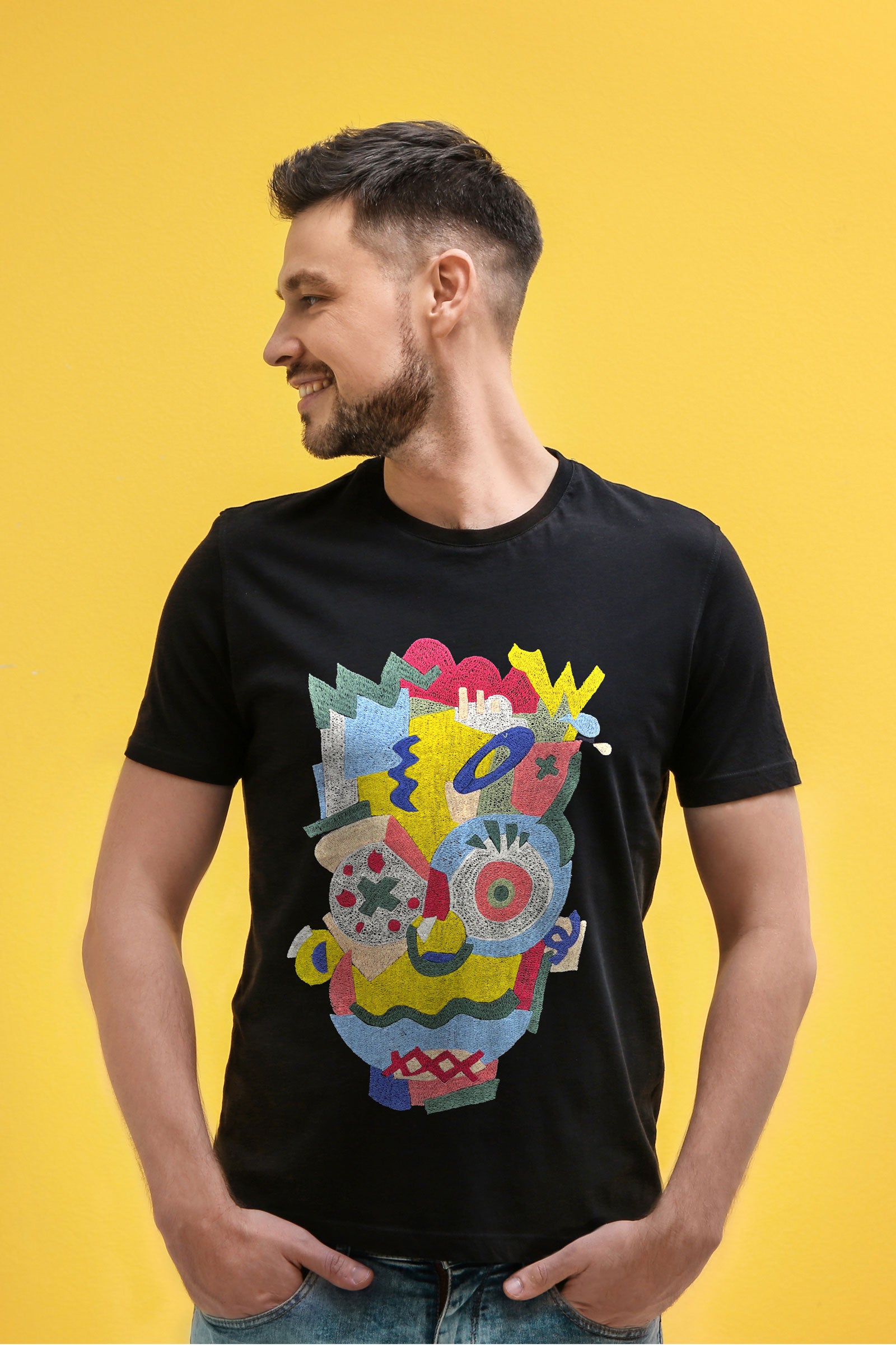 Abstract Collage Embroidered Artwork Half Sleeve Black T-shirt For Men