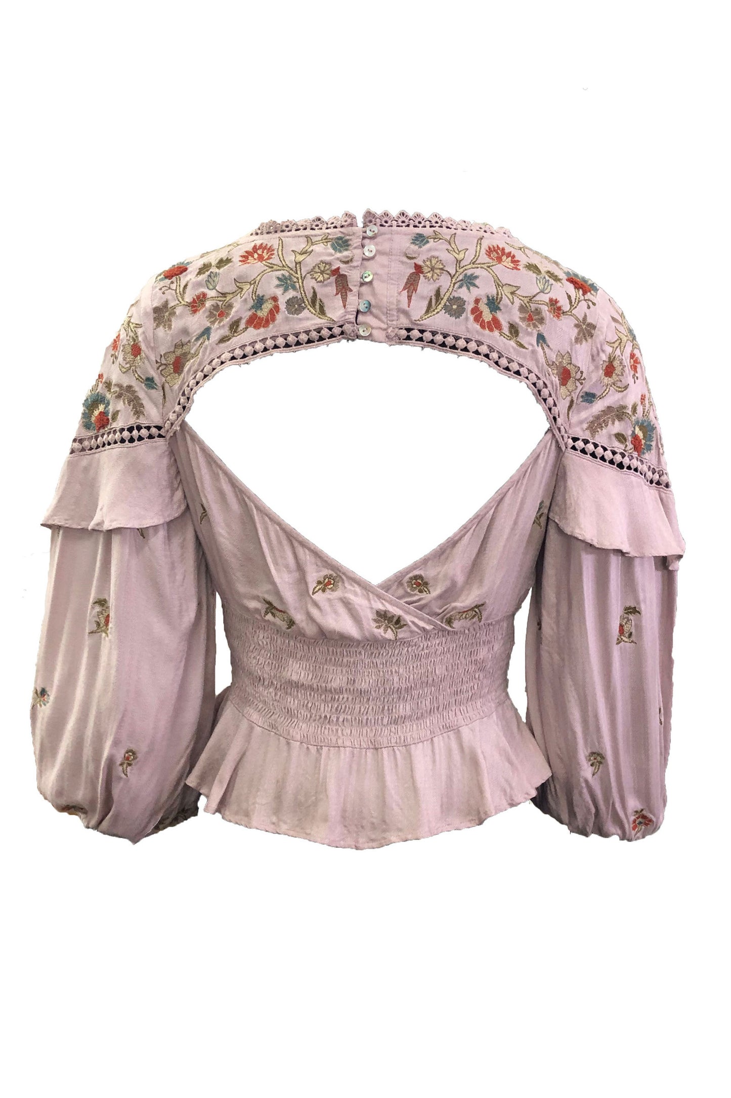 This mauve-hued blouse is crafted in a lightweight Rayon Dobby fabric for a comfortable fit and adorned with intricate floral embroidery and a stylish open back.