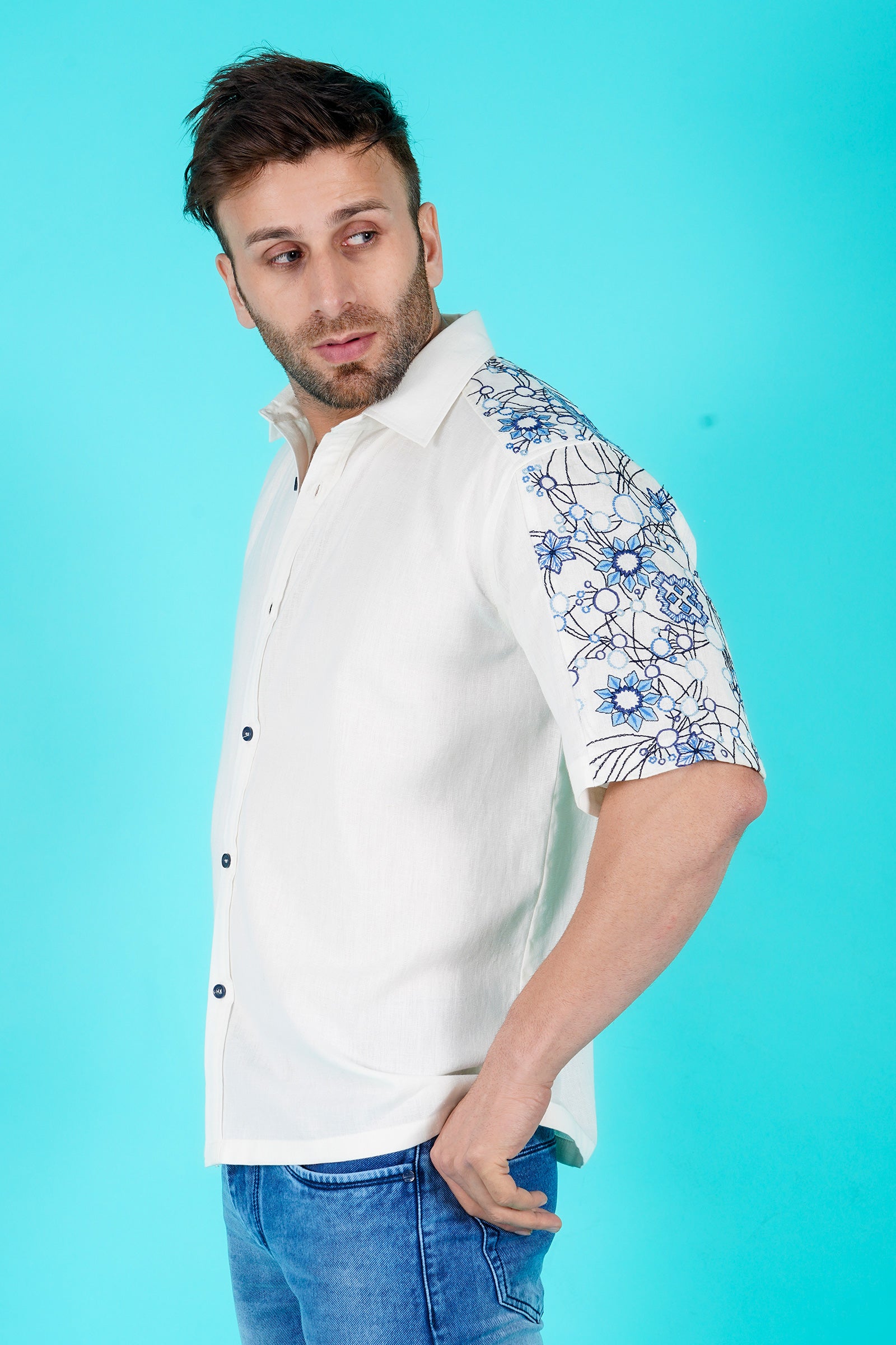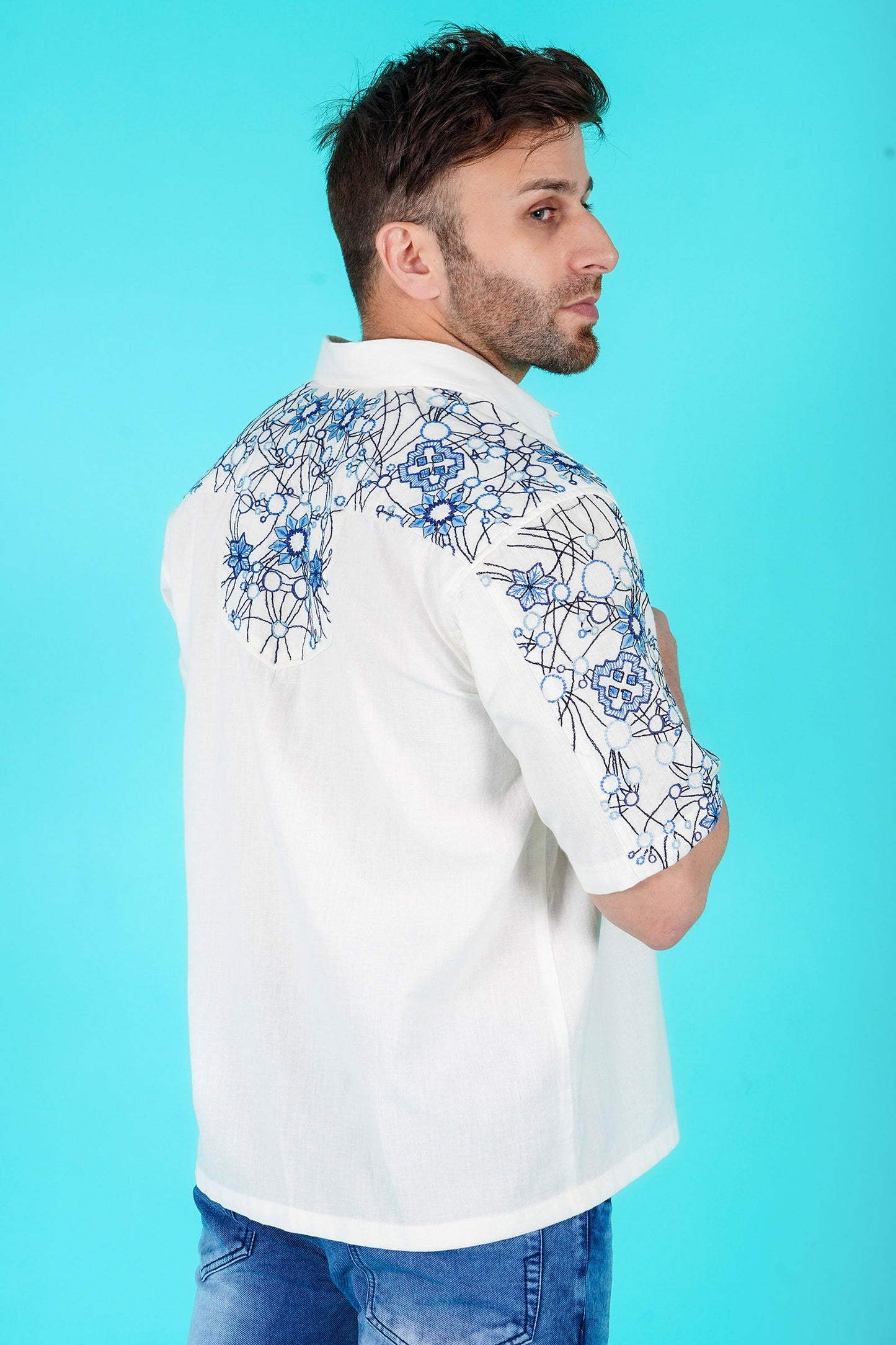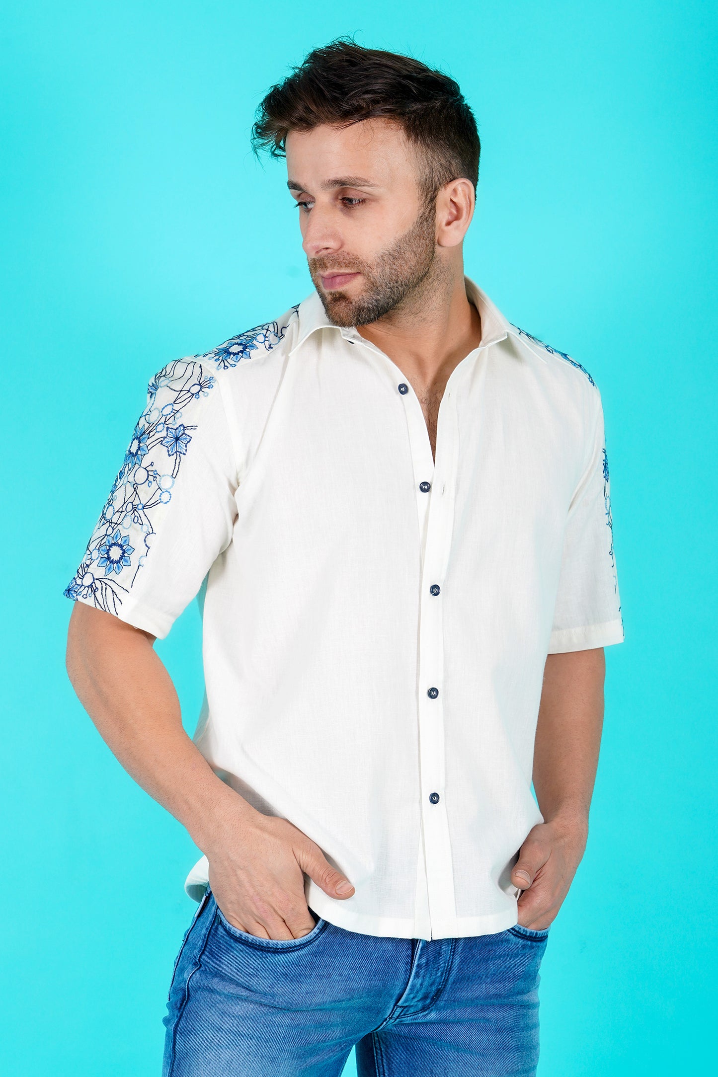 Cotton Flex off white shirt with abstract design embroidery on yoke is so different yet fashionable which makes it perfect for you to stand out everywhere.