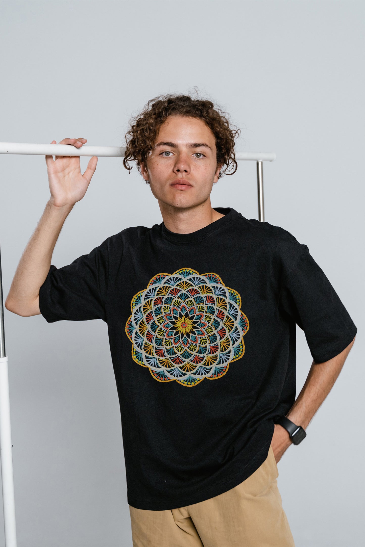 Geometric Artwork Embroidered Half Sleeve Black Oversized T-shirt For Men