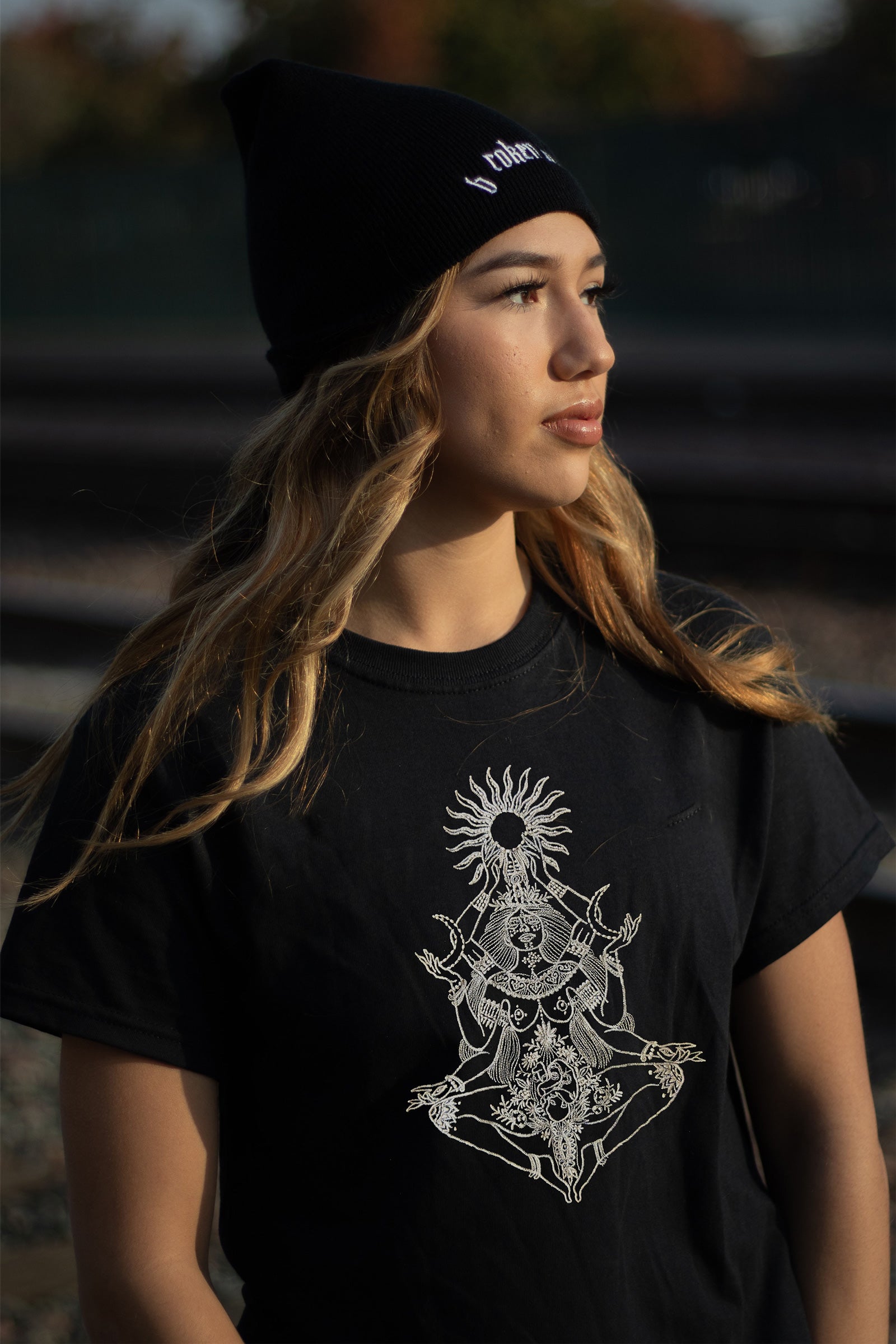Goddess Kali Embroidered Artwork Half Sleeve Black T-shirt For Women