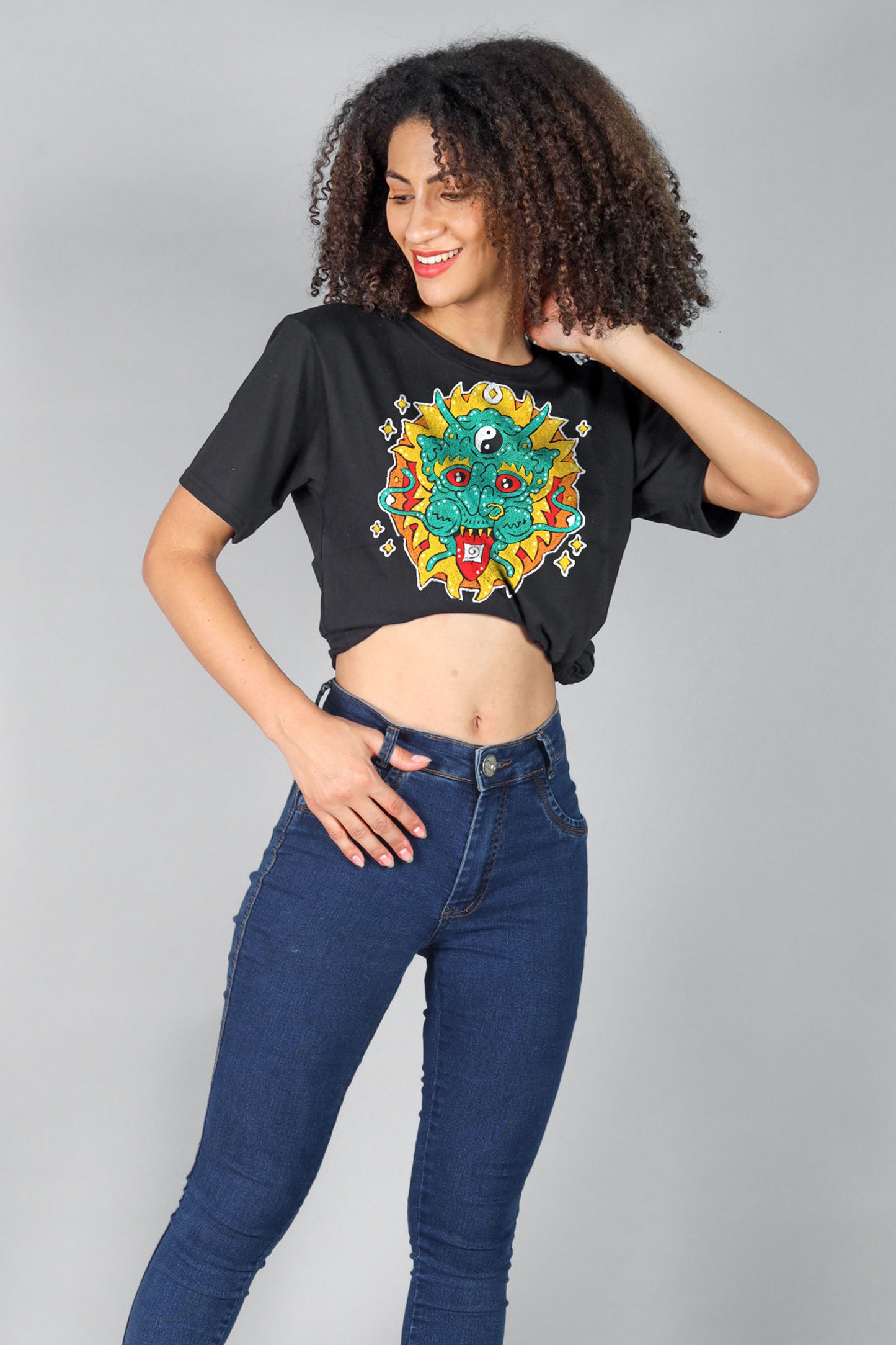 Magic Dragon Embroidered Artwork Half Sleeve T-shirt For Women