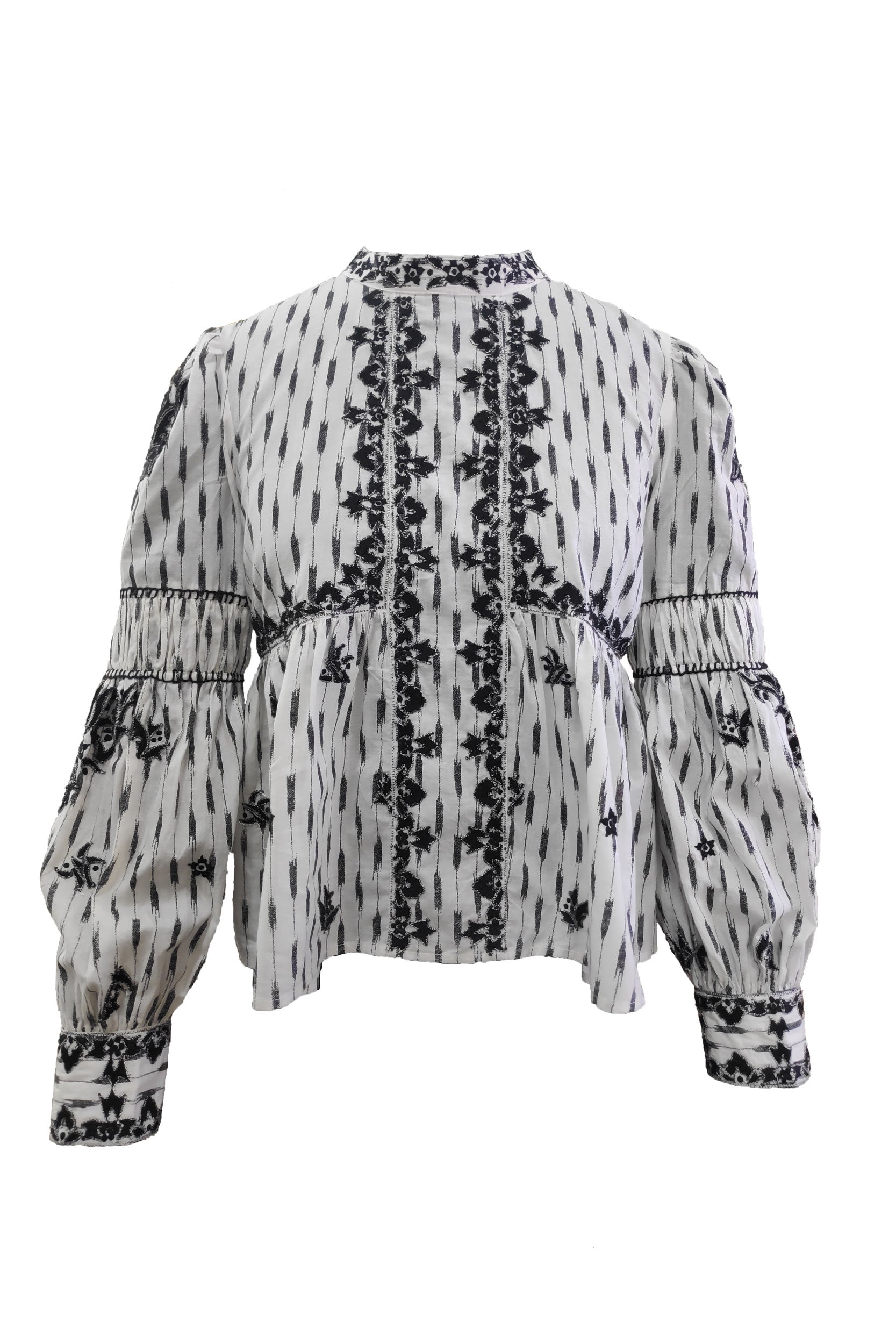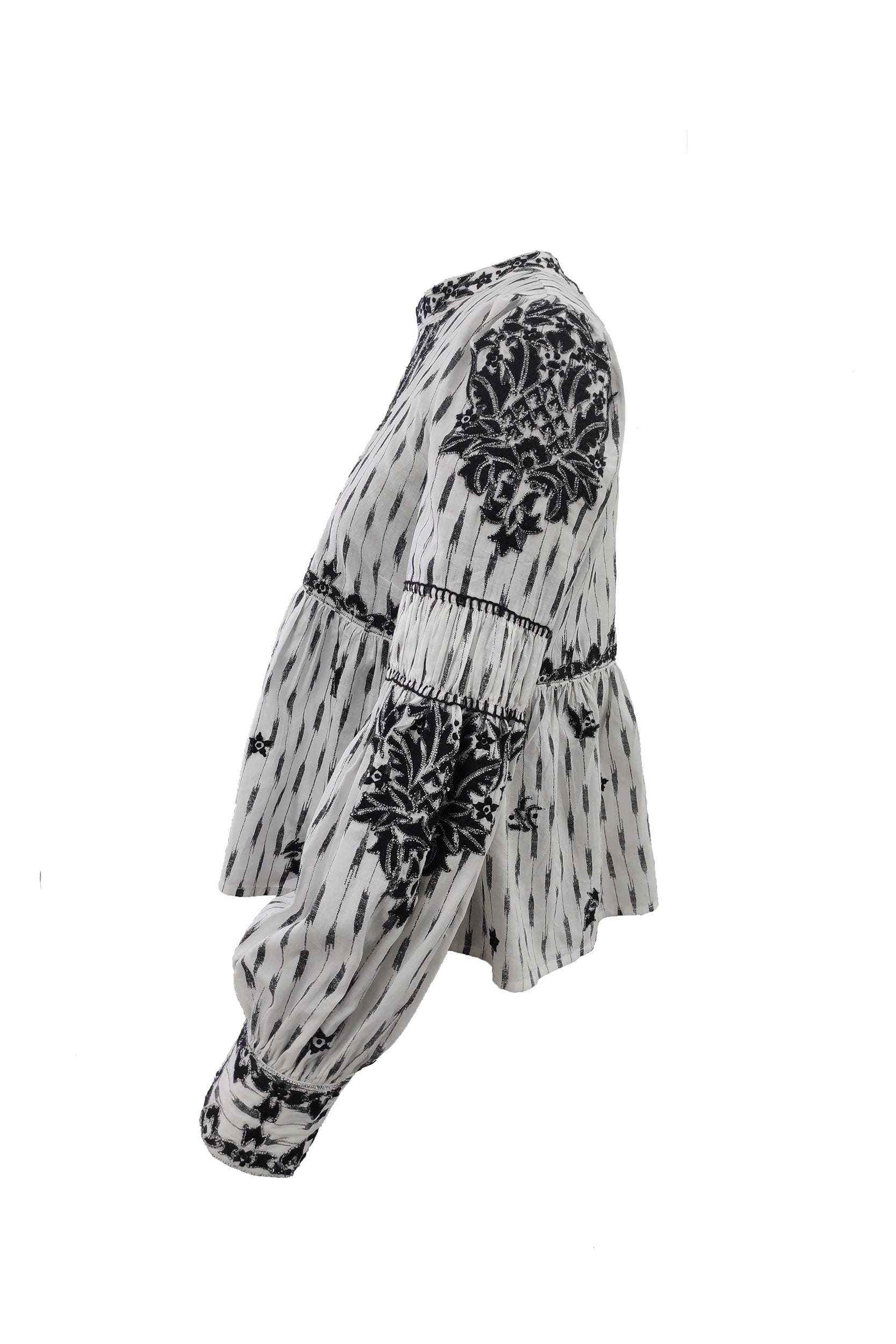 This Olivia Embroidered Boho Blouse is elegantly designed with black and white prints, as well as intricate embroidery, elevating its aesthetic appeal. Further, the blouse features a large slit at the back, lending it a tasteful touch of sexiness, making it suitable for both formal and leisure occasions.