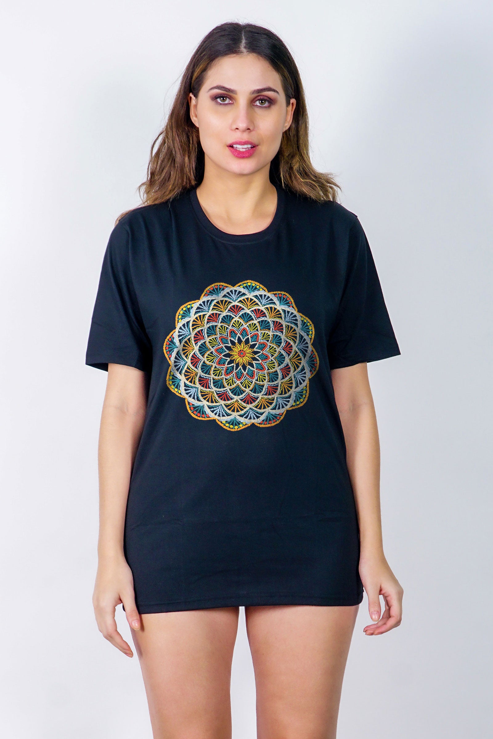 Embroidered Geometric Artwork Half sleeve Black T-shirt For Women