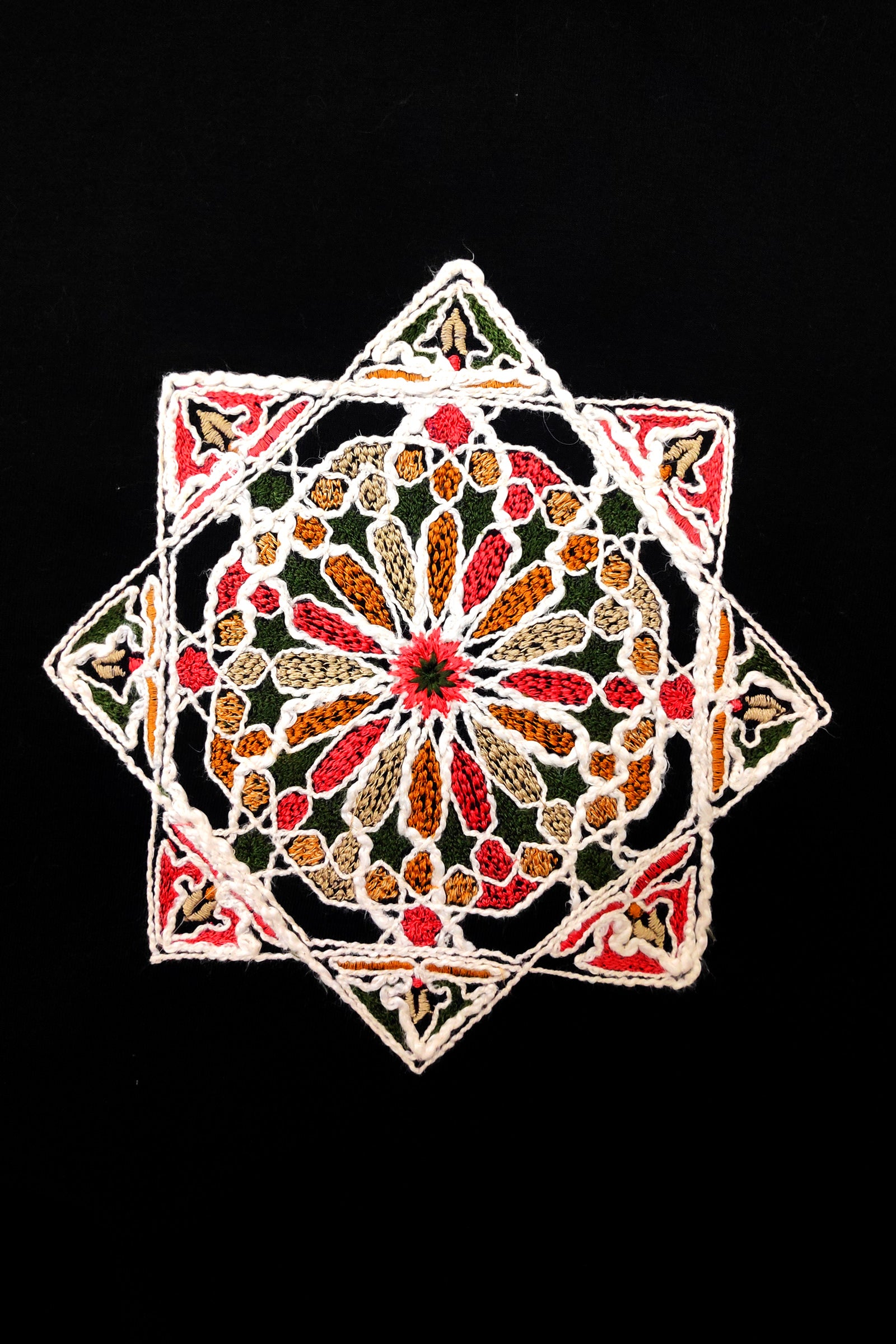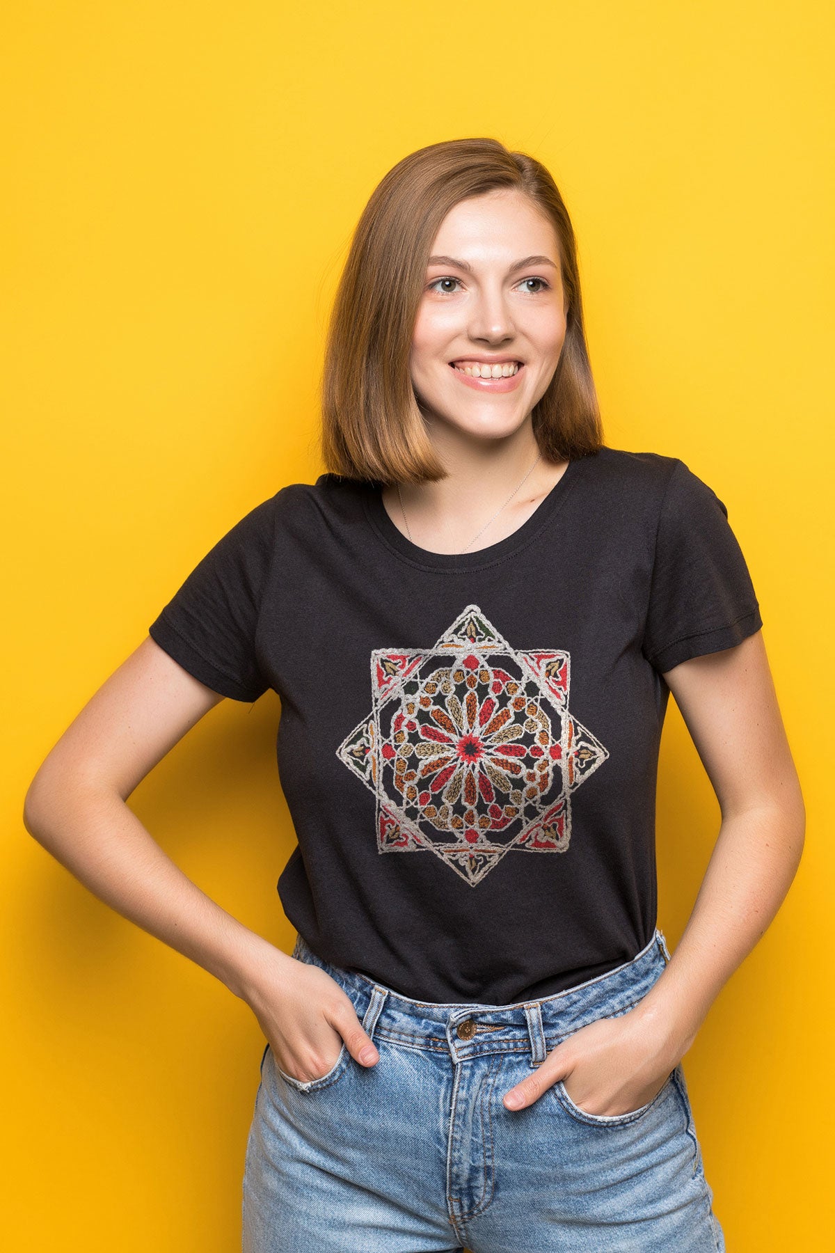 Sacred Geometry Embroidered Artwork Half Sleeve Black T-shirt For Women